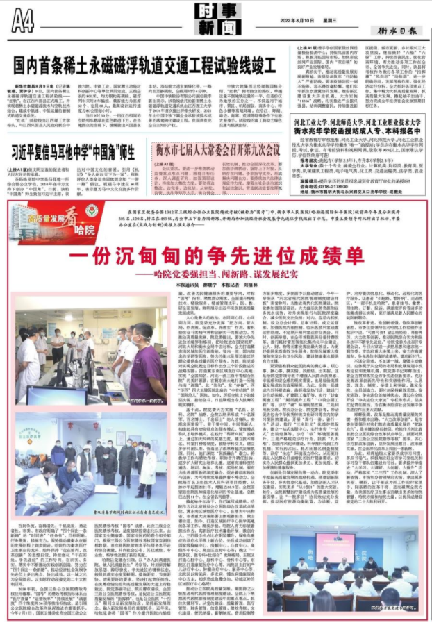 百舸爭流,奮楫者先;千帆競發,勇進者勝。市委、市政府明確了“四個闖出一條新路”的“時間表”“任務書”,目標明晰、任務聚焦、措施有力,推動著衡水在新的發展征程上闊步前進。衡水市人民醫院(哈勵遜國際和平醫院)作為衡水醫療衛生事業的龍頭,始終保持“走在前列,改革創新”的思想自覺,強化“干在實處,爭先進位”的工作導向,在求實、務實、落實中不斷推動實踐創新創造,努力在“四個闖出一條新路”、推動經濟社會發展爭先進位上多出亮點、快出成效,以一域之光為全局添彩,以實際行動迎接黨的二十大勝利召開。