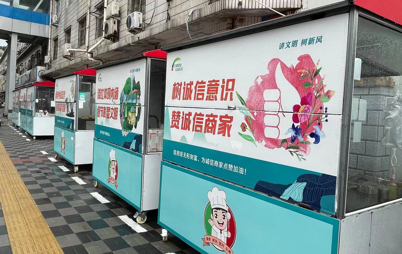 這些新型的早餐車擁有藍色的車身,統一的標識牌,車上還繪制著簡潔亮麗的文明宣傳畫,標注著“誠信待人、服務至上”“樹誠信意識、贊誠信商家”等公益宣傳語。在早餐攤主的忙碌中,餐車前蒸騰出一團團熱氣,煎餅、肉夾饃、手抓餅……這些大眾早餐品類齊全,一陣陣香味隨風撲鼻而來,讓人垂涎。“這里的早餐攤既整潔又規范,吃起來也放心!”一位市民從遠處走過來,看到眼前排列整齊的餐車,買下了一份早餐。