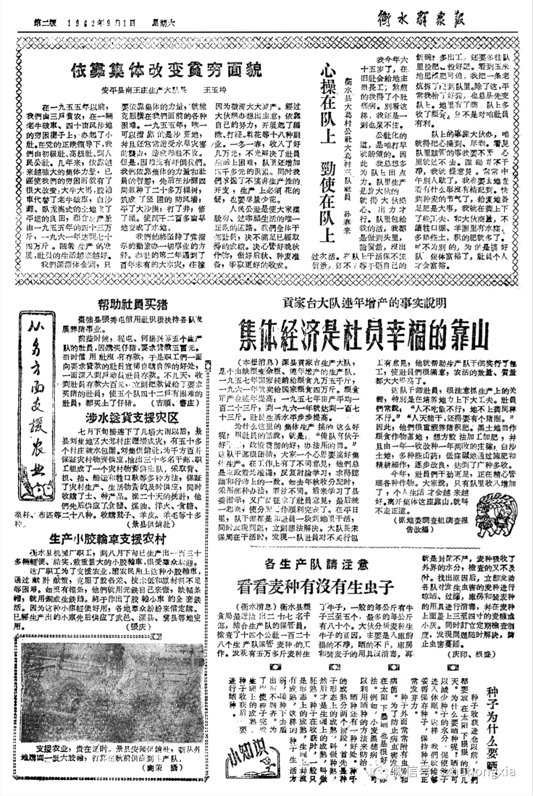 為什么要有這許多感慨?因為明天,2022年9月1日,是《衡水日報》創刊60周年紀念日。幾天前我微信里找張起軒要來了1962年《衡水群眾報》(后改為《衡水日報》)創刊號四個版面的圖片。起軒是1980年代后期入職報社的,現在是副總編輯。他還給我看了轉發老同事追憶文章到朋友圈時他加上的按語: