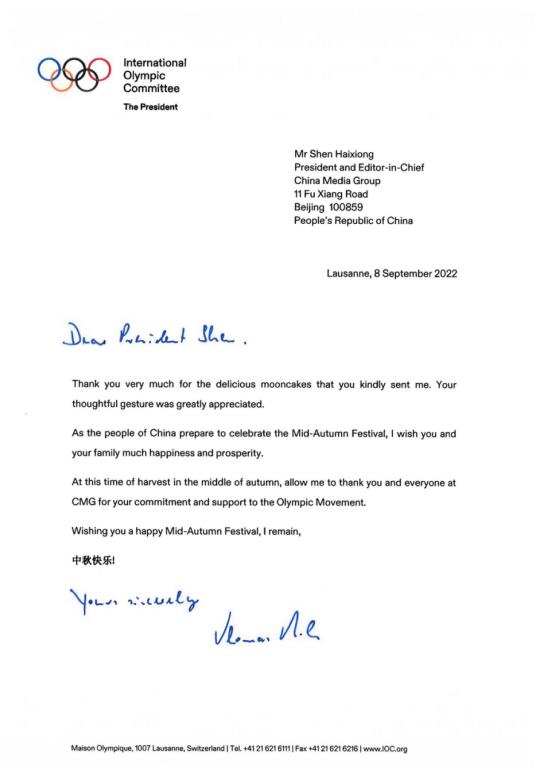 央視網(wǎng)消息:在中華民族傳統(tǒng)節(jié)日中秋佳節(jié)到來之際,國際奧委會主席巴赫向中央廣播電視總臺發(fā)來親筆信函,感謝總臺對奧林匹克運動的支持與承諾,并以中文和英文祝福總臺全體員工節(jié)日快樂!
