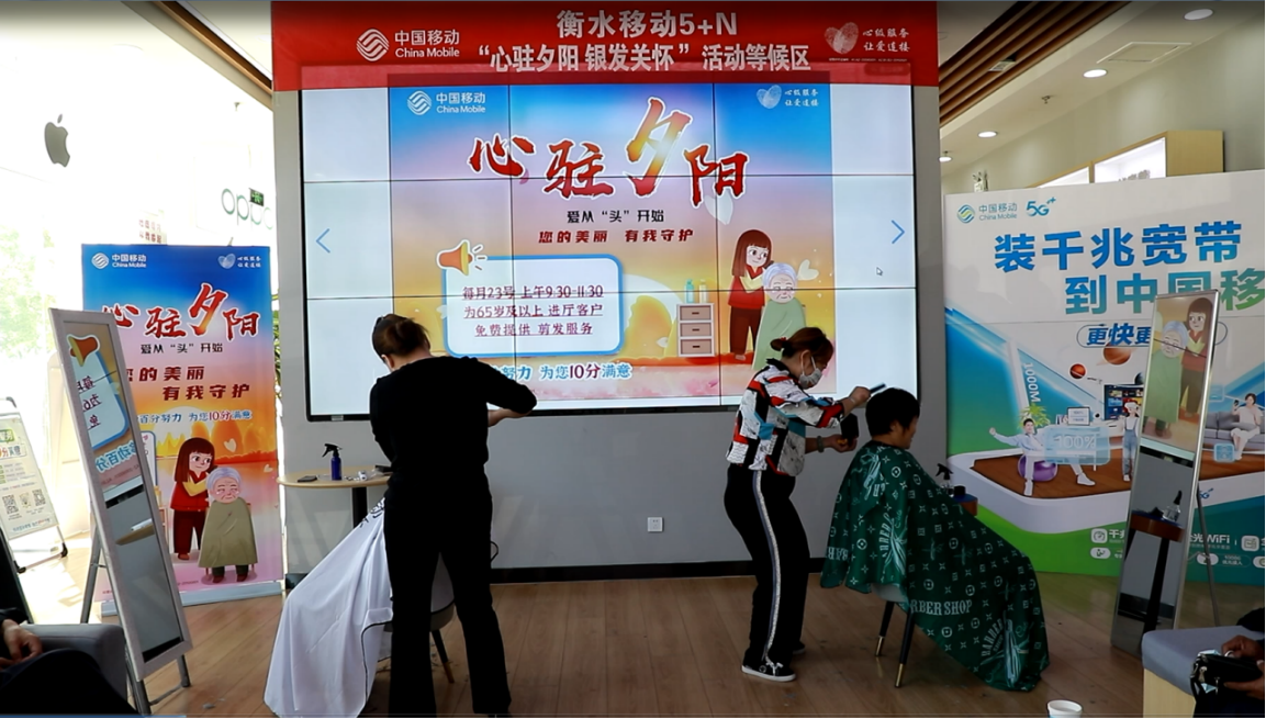 為了讓更多的客戶接收到服務信息,活動前一周,衡水移動制作宣傳小視頻,通過抖音、視頻號、客戶群、微信公眾號等方式,進行線上宣傳預熱;同時在營業廳醒目位置擺放銀發義剪活動海報,并對進廳客戶100%口頭告知服務內容。