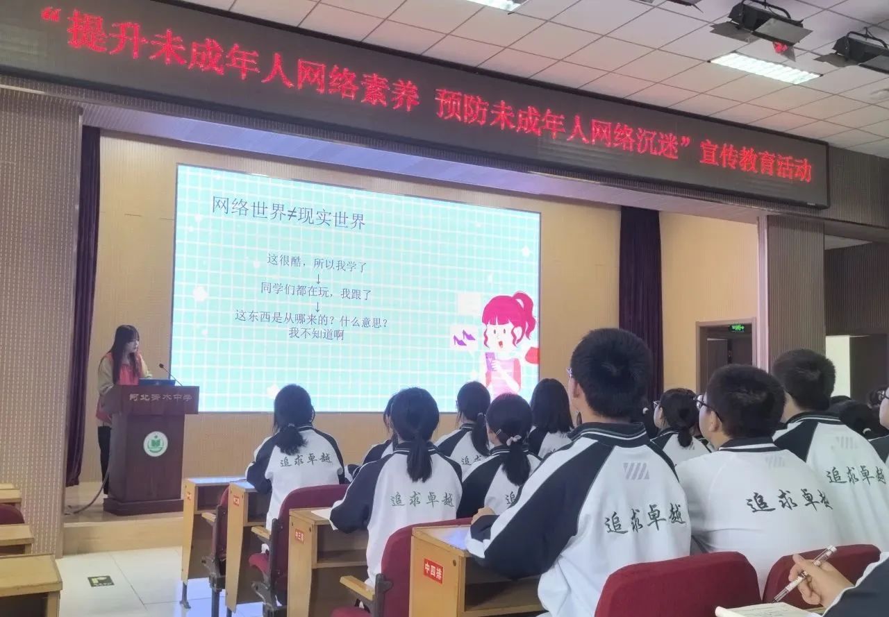 活動中,市七院精神心理科醫(yī)師牛孟娣進行了題為《向陽成長 共享健康網(wǎng)絡(luò)》的宣教講座。“網(wǎng)絡(luò)現(xiàn)在是無處不在,比如智能家居、手機訂票點餐支付、上網(wǎng)課等等,很大程度上方便了我們的學(xué)習(xí)、出行、消費和娛樂等,豐富了我們的生活。但網(wǎng)絡(luò)是一把雙刃劍,它有哪些危害呢,同學(xué)們暢談一下吧……”講座中,牛孟娣通過案例、現(xiàn)實生活感受和理論相結(jié)合的方式,針對中學(xué)生的年齡和心理特點,從沉迷網(wǎng)絡(luò)的危害、界定、類型,網(wǎng)癮的成癮機制,預(yù)防網(wǎng)絡(luò)沉迷的自我控制和家庭正確引導(dǎo)等方面進行了詳細(xì)講授。特別是在列舉現(xiàn)實生活案例時,其講到現(xiàn)在有部分小學(xué)一、二年級孩子甚至是幼兒園的孩子,都在利用網(wǎng)絡(luò)獲取“便利”,比如“小度小度,9+6等于幾”,得到了學(xué)生們的共鳴,在場學(xué)生積極參加交流互動,現(xiàn)場氛圍非常熱烈。
