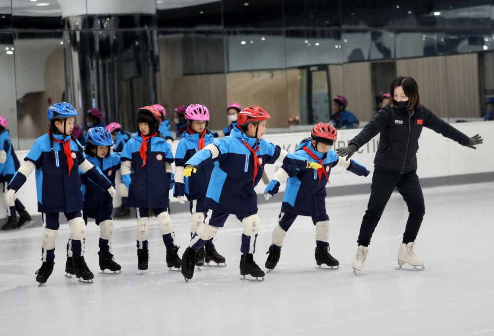 在上海新世界城的冰雪樂園,黃浦區(qū)盧灣一中心小學(xué)的學(xué)生在教練的指導(dǎo)下練習(xí)滑冰(2021年12月22日攝)。新華社記者 劉穎 攝