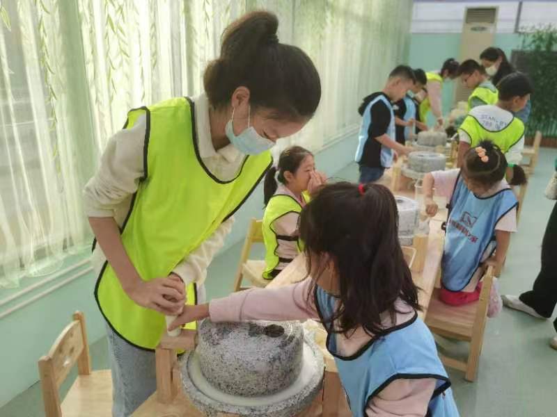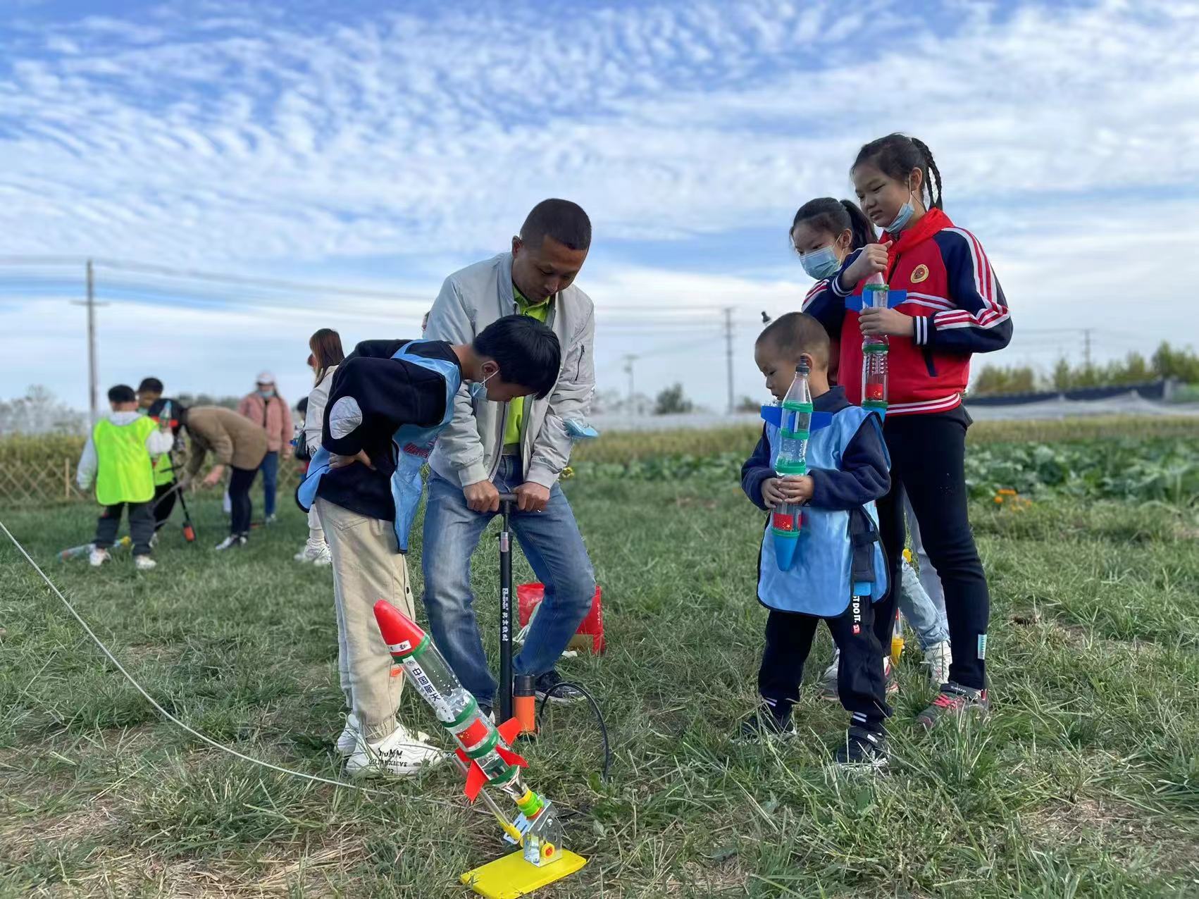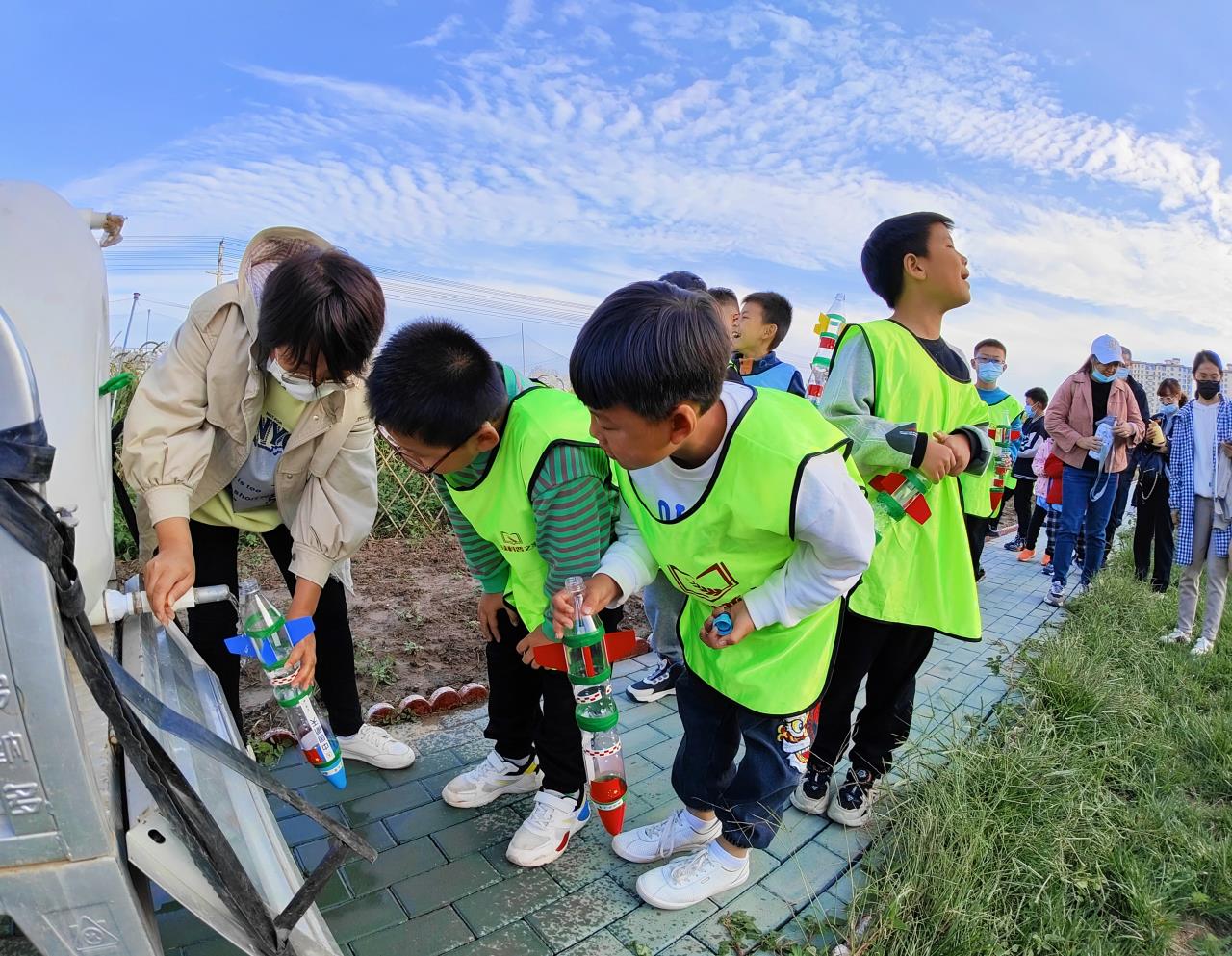 隨后,家長和孩子們跟隨著老師用石磨磨豆?jié){,大家兩人一組,一個負責(zé)往石磨洞里加水和豆子,一個賣力地旋轉(zhuǎn)石磨。看著米白色的濃稠液體從石磨底下的溝槽中溢出來,大家都非常開心。接下來的水火箭制作課程更受孩子們的青睞,在老師的指導(dǎo)下,大家細心地組裝、裝水、加壓、發(fā)射。“哇!成功了!”伴隨著歡呼聲,一枚枚自制水火箭承載著孩子們的激情與期待一飛沖天,現(xiàn)場水花四濺、笑聲陣陣。孩子們既感受到了科技的無窮魅力,又在幼小的心靈中埋下了一顆“飛天”的種子。