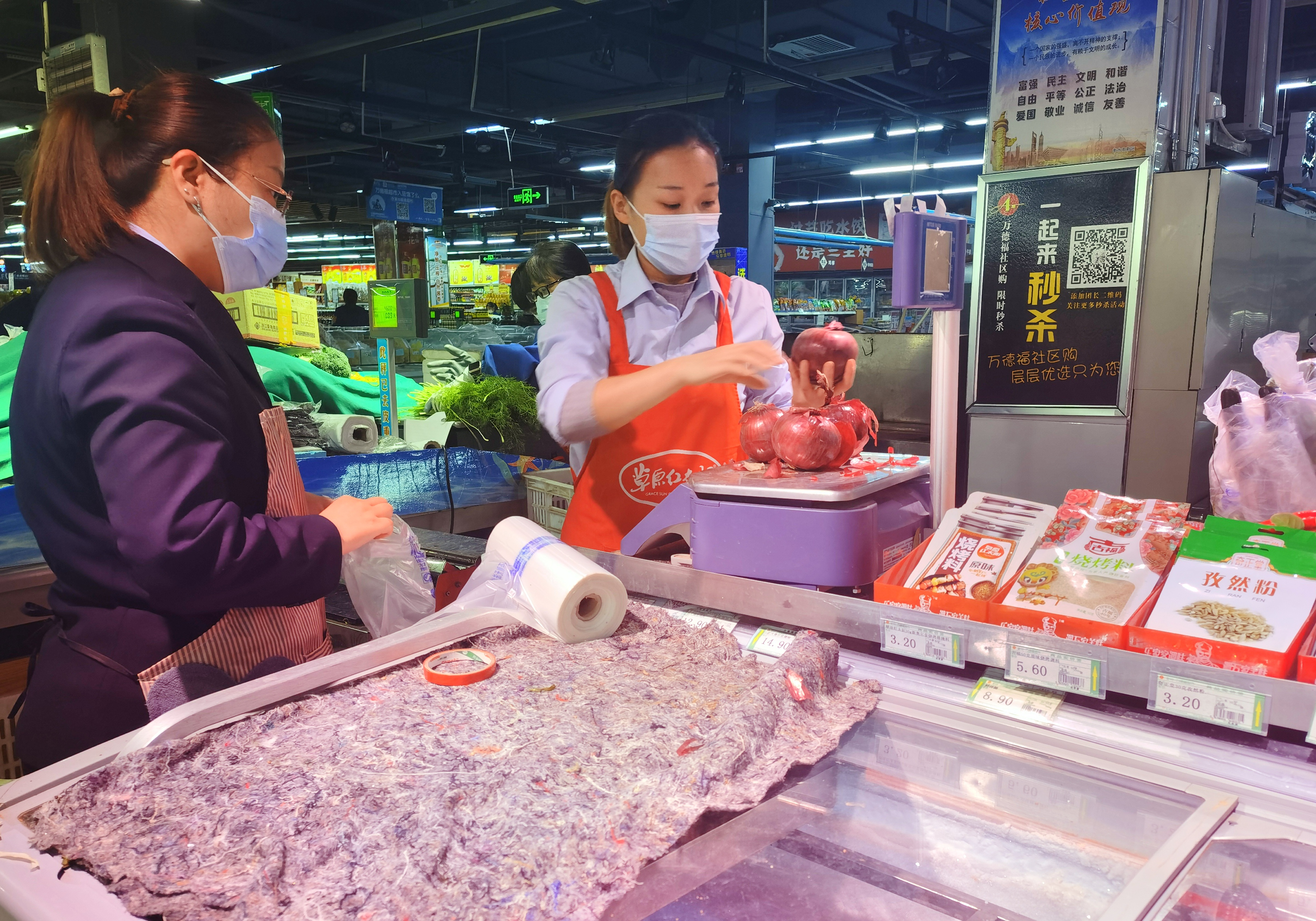 “疫情防控期間,我們店日均蔬果供應(yīng)量是5000多斤、肉類(lèi)3000多斤,米面油也十分充足,完全能保證日常供應(yīng)”,萬(wàn)德福前進(jìn)街店店長(zhǎng)周海介紹說(shuō),店內(nèi)目前在崗300多人,每天從早上7點(diǎn)一直忙碌到夜里9點(diǎn);而且安排有130多人的配送隊(duì)伍負(fù)責(zé)為市民送物。