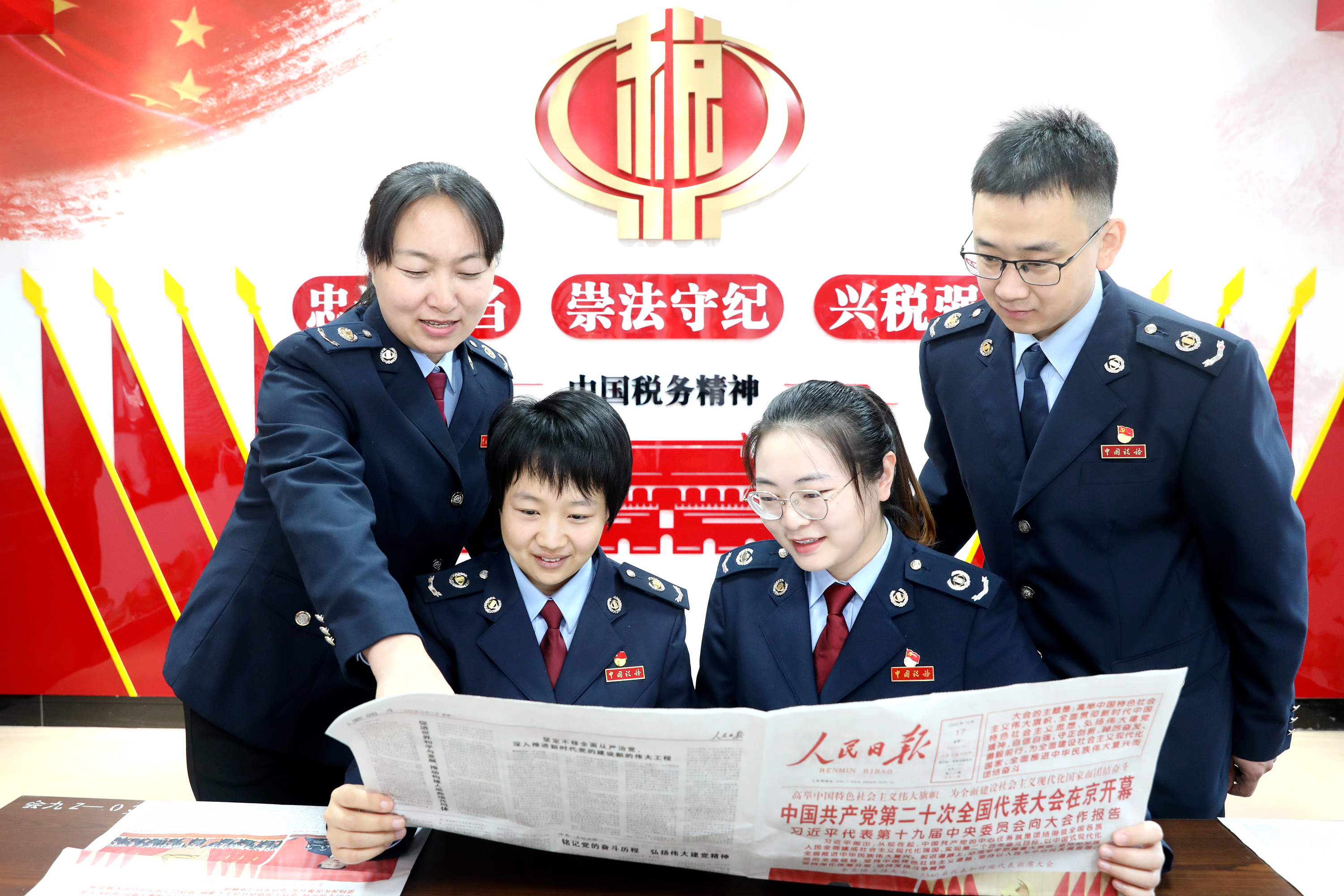 桃城區稅務局工作人員集中學習黨的二十大報告。