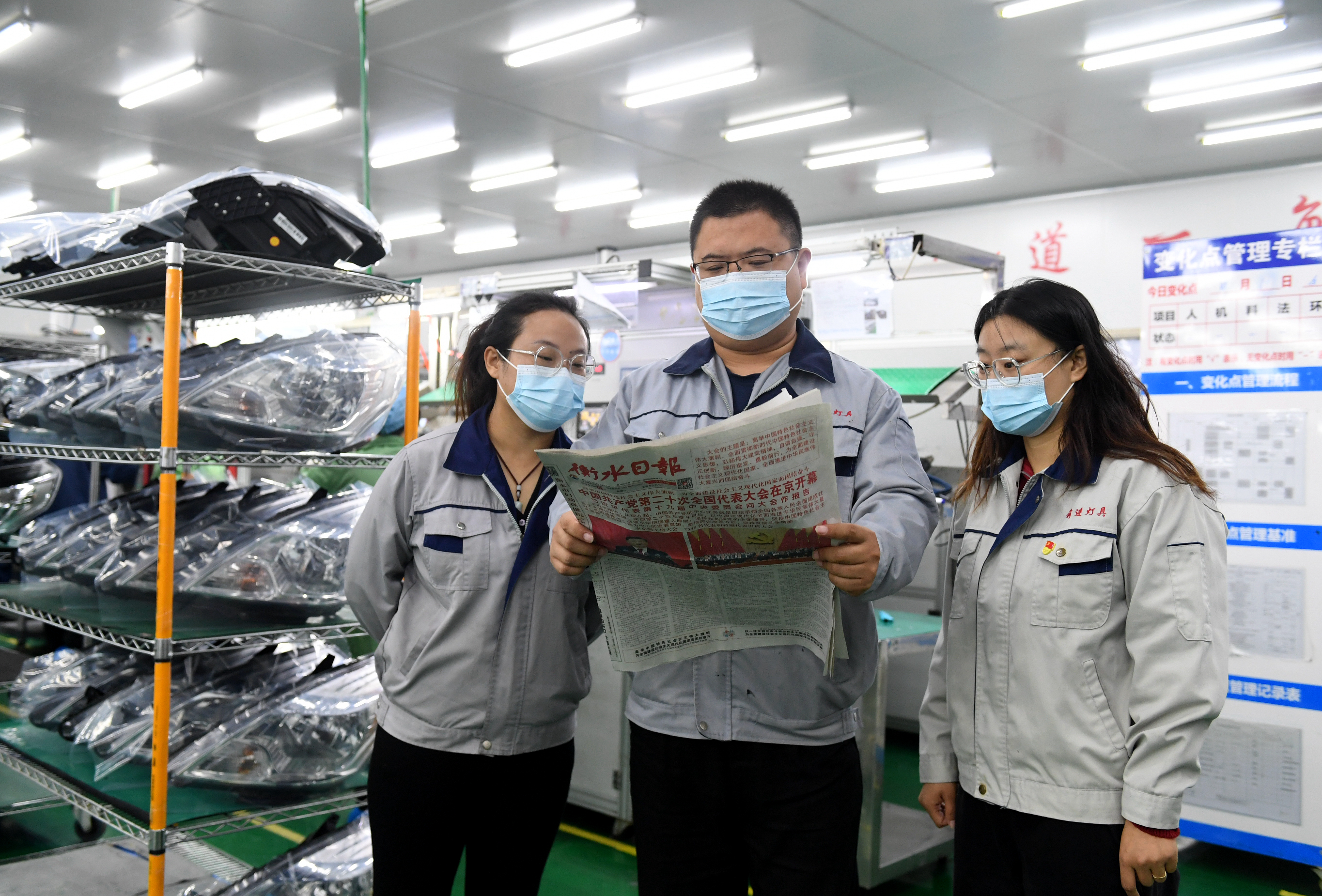 阜城縣前進燈具有限公司員工學習黨的二十大報告。