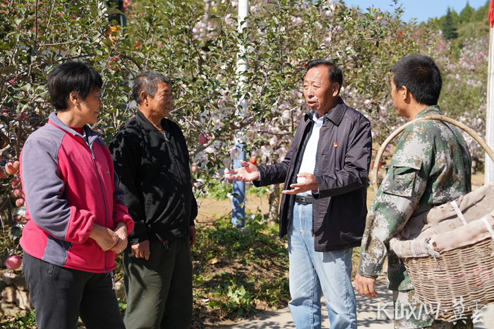 內丘縣崗底村黨總支書記楊雙牛(右二)向村民詢問蘋果采摘情況。 長城網·冀云客戶端記者 郭碩 攝