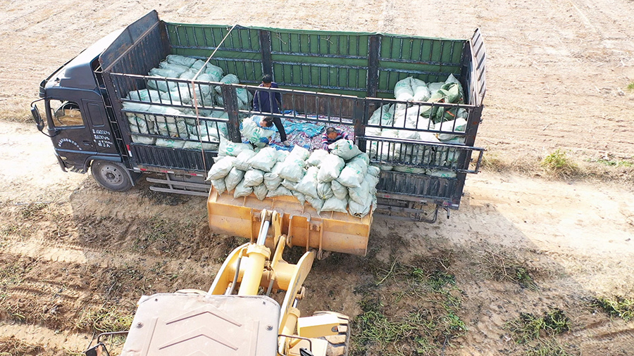種植戶將成袋的紅薯裝車。倪志浩 攝
