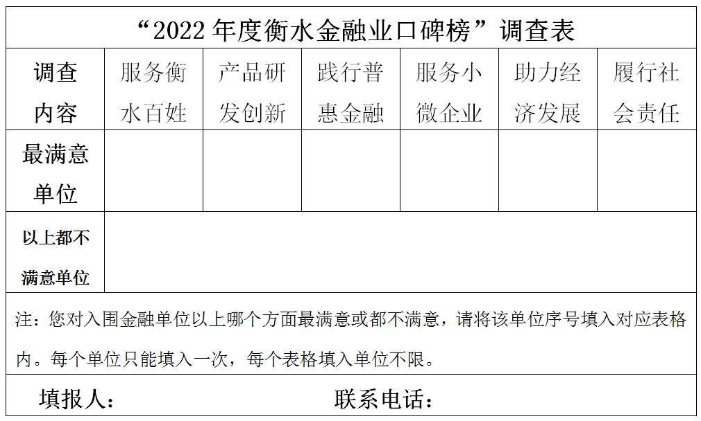 “口碑榜”調查旨在通過消費者、企業、行業等多方認同的方式,讓衡水百姓對衡水金融單位服務能力、創新能力、產品特色、社會責任等各方面服務表現做出公正評判。以此來激勵、引導各金融機構不忘初心、牢記使命,積極服務衡水人民、助力地方經濟發展,為衡水經濟社會高質量發展做出應有貢獻。