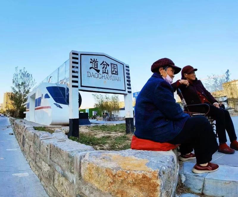 當天下午4時,記者從南側主入口進入道岔園,入口廣場上的火車頭景觀造型首先映入眼簾。這一造型由原始火車頭模型與和諧號機車模型拼合而成,中間以鏡面墻進行分割,在視覺上實現景觀的完整性,巧妙體現了交通的新舊交替,傳承與發展。往公園內走,在特色廊架下,家住糧庫家屬院的安阿姨正和鄰居們坐在枕木凳上休憩,她對這個“口袋公園”贊不絕口:“之前,我們也是在附近遛彎,那時每人手中拿著一個小馬扎,走累了就找地方坐下歇會兒。原來這里有個大土堆,每次遛彎回家都是一身土。小公園建好后,環境好了,設施多了,我們有地兒去了,心情也舒暢了。”