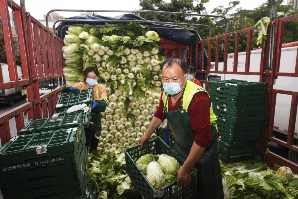 11月12日,在位于渝北區的重慶慶榮物流有限公司,工作人員在搬運蔬菜。新華社記者 王全超 攝