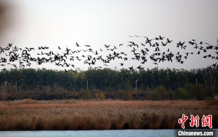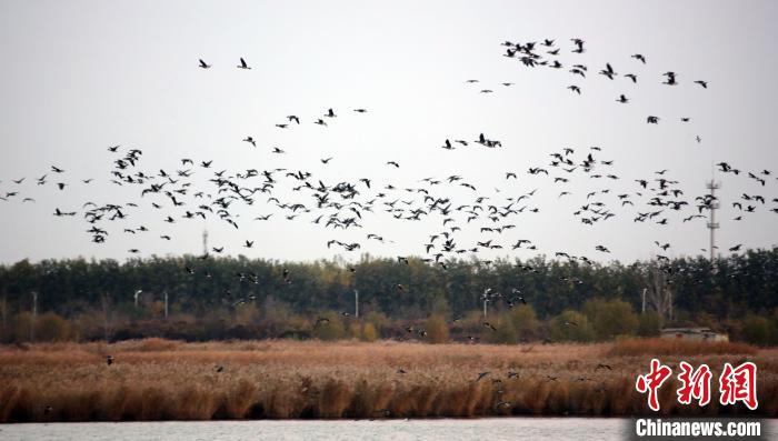“鳥浪”飛過衡水湖近岸的蘆葦蕩。 張凱 攝