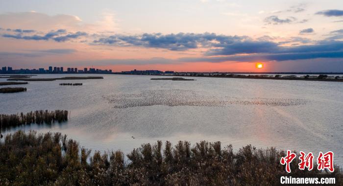 “鳥浪”與衡水湖岸邊的城市構(gòu)成了人與自然和諧共生的畫卷。 張凱 攝