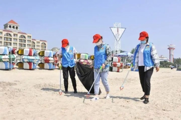 夏日海邊經常有志愿者撿拾垃圾。