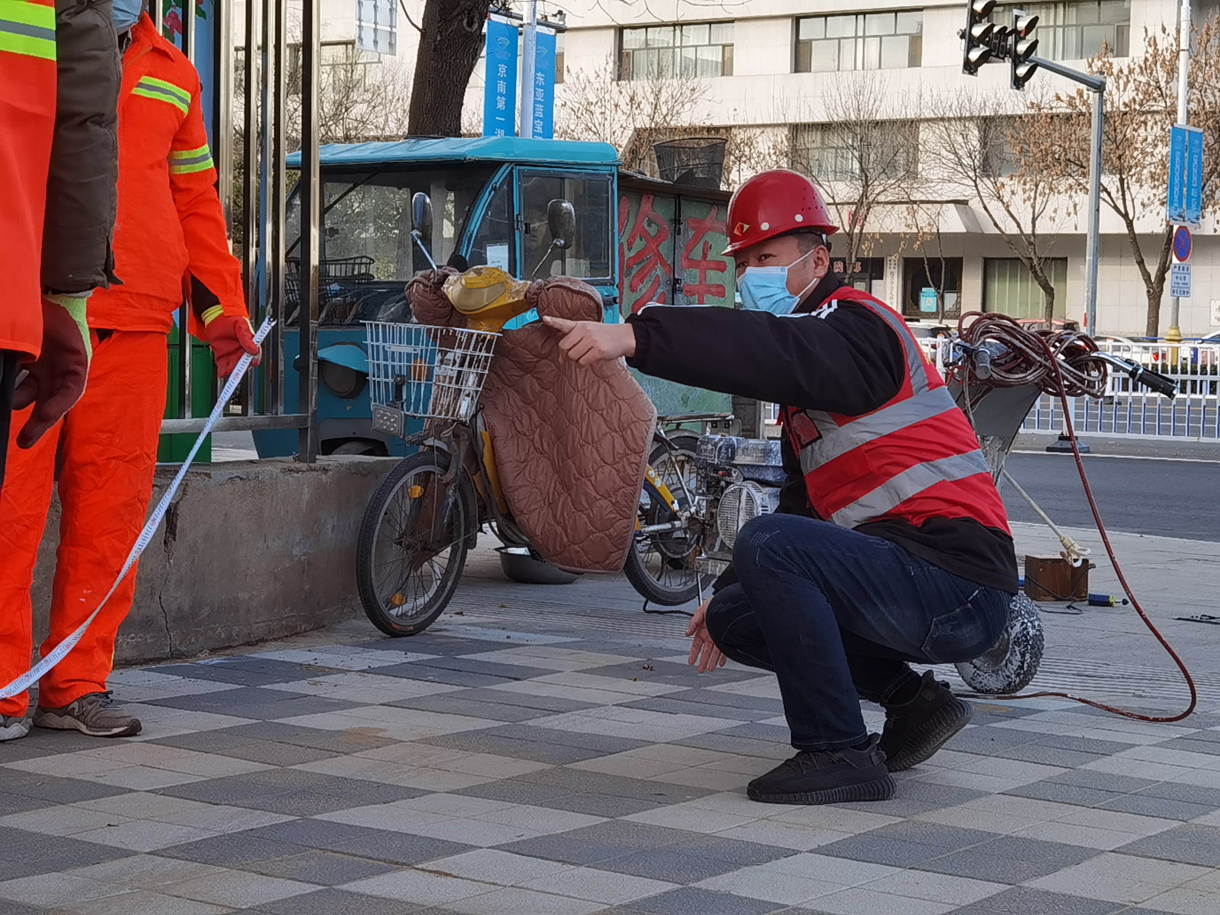 “昨天晚上十點,我給科室的五個作業組分派好了今天的活兒,一共是65處道路維護工單。”例行巡視過后,王洪磊立刻趕往中心街與永興路交叉口。此前,他帶著作業班組對東南角的破舊便道進行了更新改造,回收可二次利用的舊便道磚,清理砂漿層等,將舊便道磚整體更換為美觀結實的仿石磚。今天,他們將在這里清理施工殘留灰跡、劃車位線。“用水沖刷殘留灰跡,然后用棉布把水蘸干,一定保證路面不存水,以免結冰后滑倒行人。這邊規劃兩個停車位,靠北側劃線,給清潔公廁的作業車輛留出通行道路。”王洪磊熟練地指揮著,看得出他提前備足了“功課”,施工計劃早已了然于胸。從部隊轉業回到市市政工程管理中心工作后,他把規劃先行的習慣也帶了回來,大到路面維護方案,小至工程車出車路線、備料類型,他都會提前做好規劃,并于前一天通知到各個工作組,保證維護工作精細化。