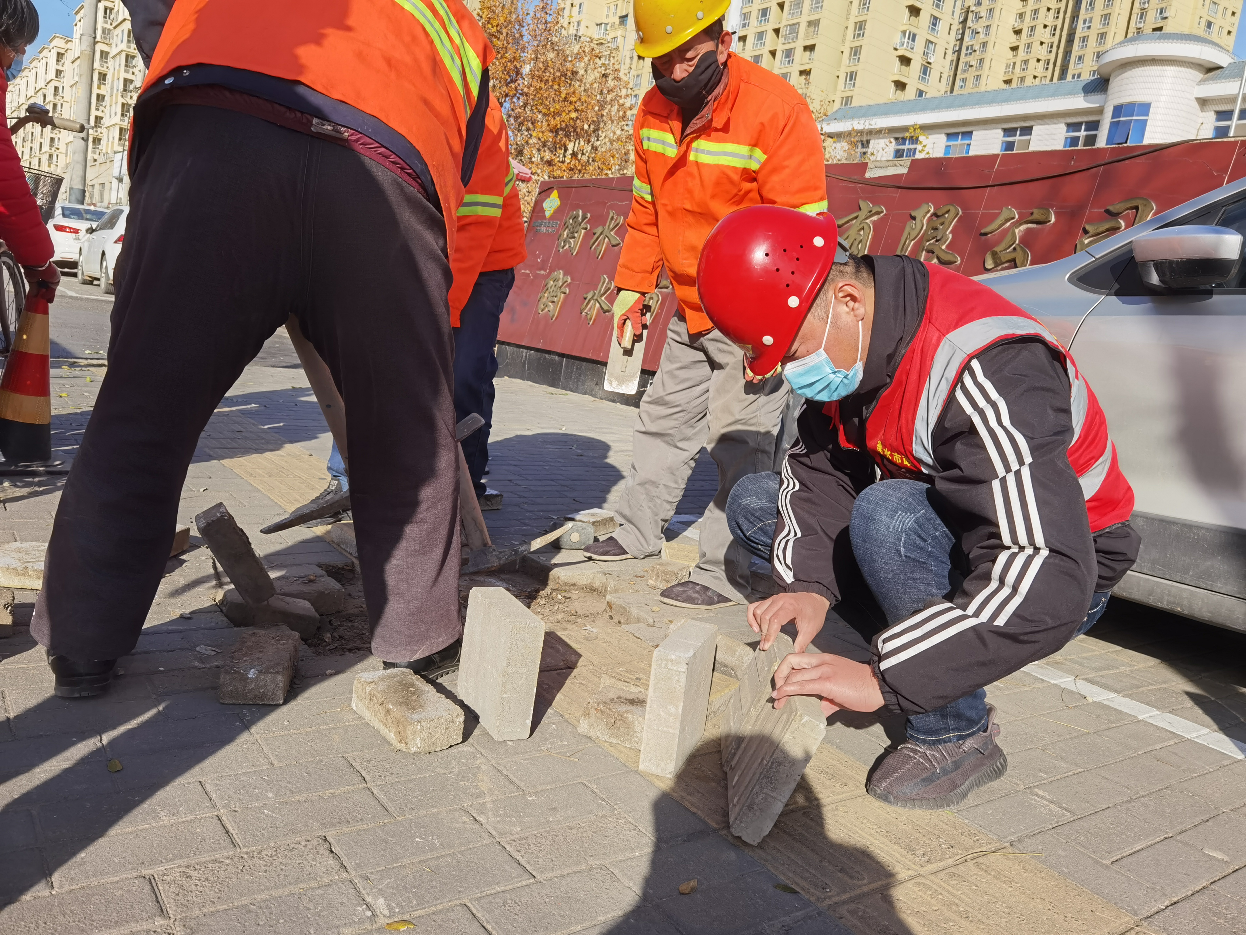 時針指向10時許,收尾工作剛一結束,王洪磊又馬不停蹄地趕到位于前街大街與和平西路交叉口附近,另一個作業小組正在進行便道維護。“用三條凸起條狀的盲道吧,平整度更高一些。”仔細地察看過現場,他簡短地交代幾句后,低頭研究起了其他工作組發過來的施工現場照片,然后打電話,細心叮囑組員們路面修補注意事項。“小事”不“小”,在王洪磊這里體現得淋漓盡致,事關民生,他力求做到細致入微。