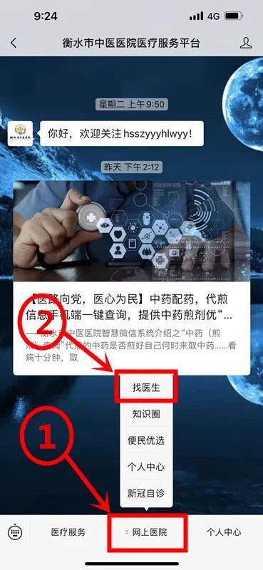 1、長按或掃描二維碼進(jìn)入“衡水市中醫(yī)醫(yī)院醫(yī)療服務(wù)平臺(tái)”