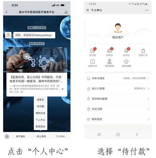 進(jìn)入“平臺(tái)”,依次點(diǎn)擊:“網(wǎng)上醫(yī)院--個(gè)人中心--待付款”,微信或支付寶支付。