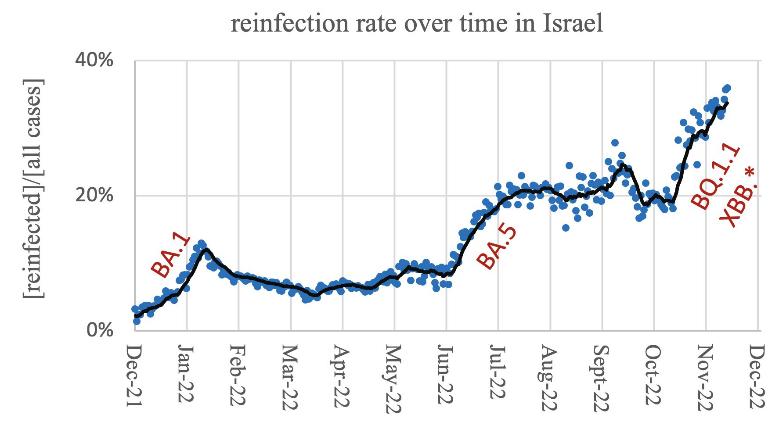 新毒株的出現是否會增加二次感染的可能,引起公眾關注。北京大學生物醫學前沿創新中心副研究員曹云龍致力于新冠病毒突變免疫逃逸機制研究。在近日的公開演講中,他援引以色列的統計數據顯示,近一年來,以色列新冠再感染率隨著新的毒株流行而走高,近幾周來,BQ.1.1和XBB(兩個奧密克戎亞變體BJ.1和BA.2.75的組合)大流行下,再感染率從20%上升到35%并且仍在增長,而在BA.1和BA.5流行時期,再感染率高峰分別超過15%和20%。