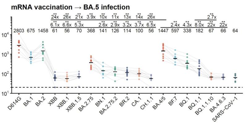 該團隊還找了大量接種mRNA疫苗的患者血漿樣本,其中有不少樣本接種了兩針滅活疫苗、兩針mRNA疫苗再加上感染了BA.5,相當于五次免疫加強,但其康復一個月后的血漿對于最新突變株的中和抗體滴度仍然較低,可能再過兩個月就無法防止再感染。這意味著,mRNA疫苗與滅活疫苗類似,在防止XBB和BQ.1.1突破感染方面的作用也十分有限。