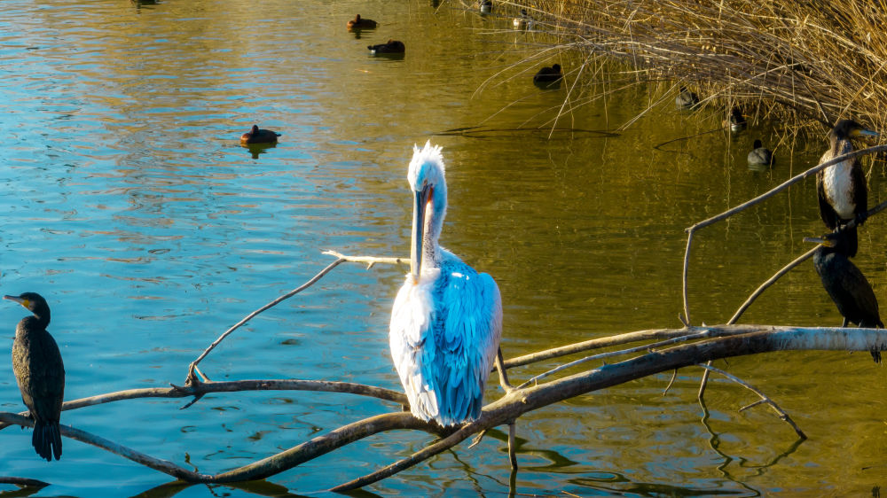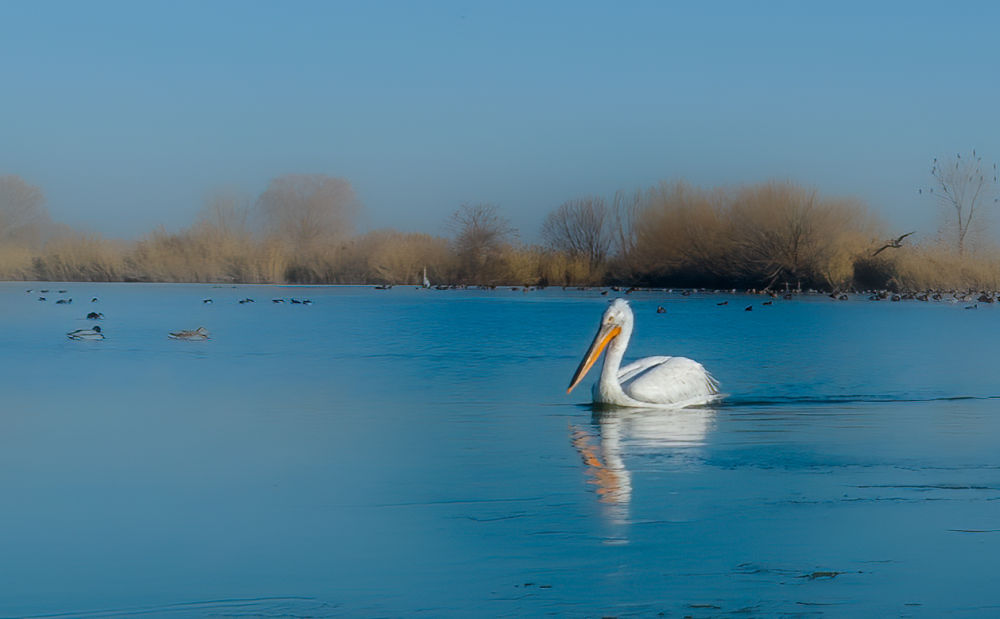 “6日下午,我在衡水湖的湖中隔堤進行日常巡查時,發現一只像小羊那么大、羽毛灰白色的大鳥停在堤邊不遠的水面上。這只鳥的長喙下部帶有橘黃色的皮囊,頭頂部羽毛卷曲。我在衡水湖邊巡湖很多年,始終沒有見過這種鳥,便將這一情況報告了當地自然保護區資源保護局。”衡水湖義務巡護員李國忠說。