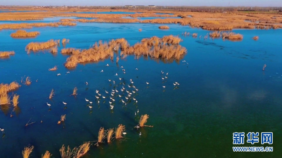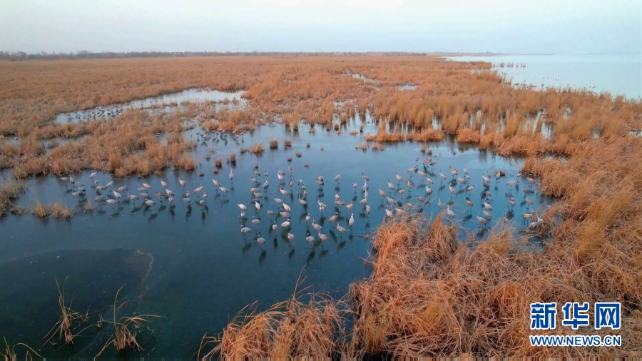 藍寶石般的湖面、金黃的蘆葦叢,灰鶴群徜徉其間。新華網發 王鐵良 攝