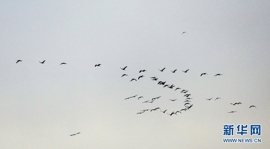 成群灰鶴在低空盤旋起舞,“舞姿”各異。新華網發 陳康 攝