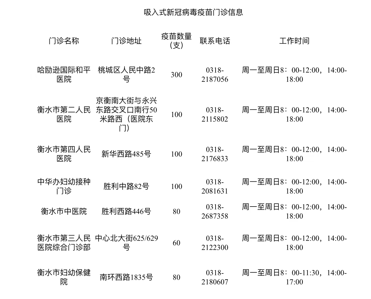 目前,我市開展吸入式腺病毒載體新冠疫苗接種門診名單如下: