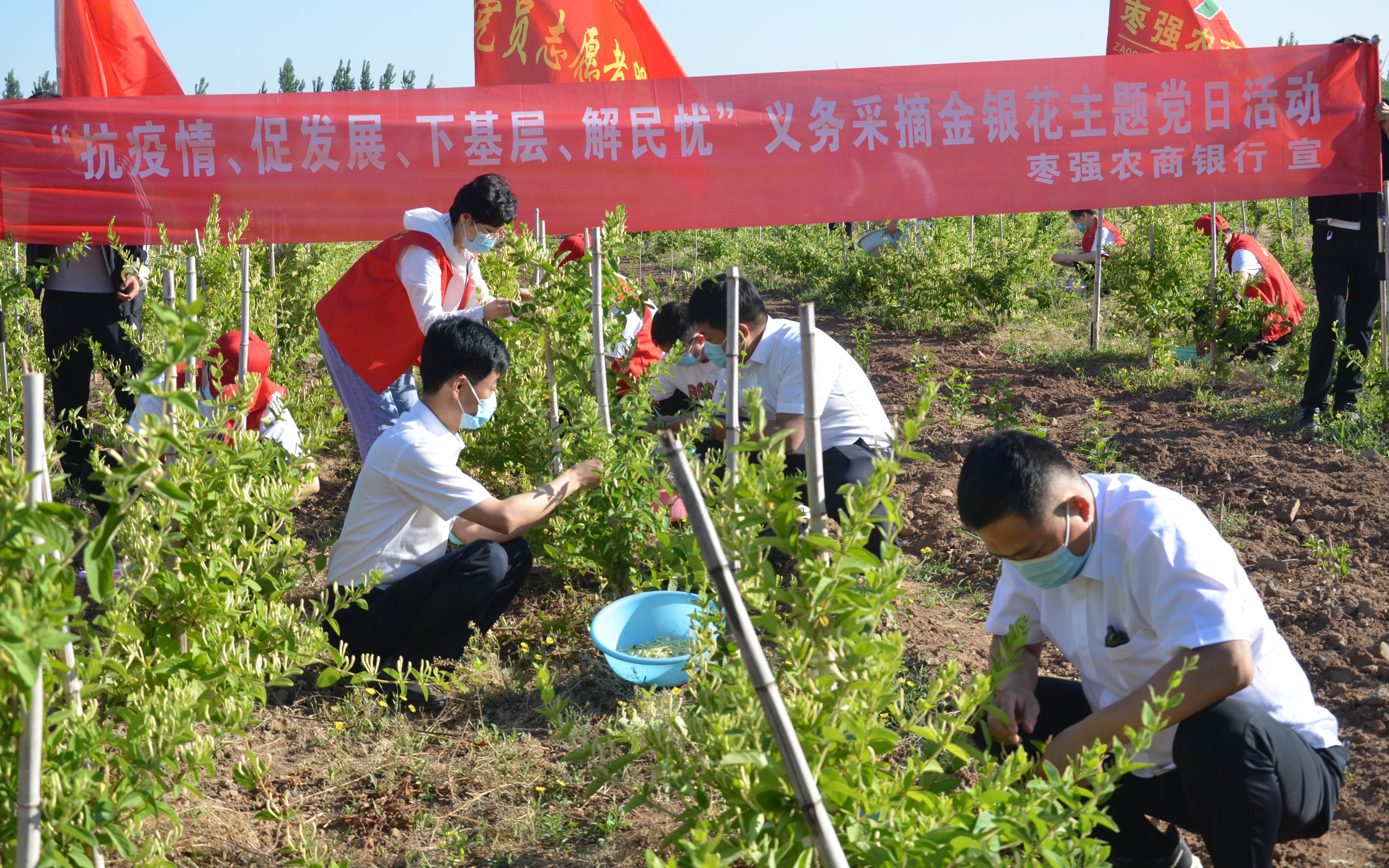 棗強農商銀行開展義務采摘金銀花主題黨日活動。