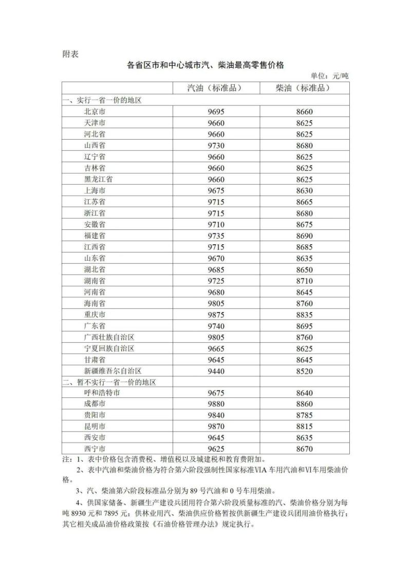 根據(jù)近期國際市場油價變化情況,按照現(xiàn)行成品油價格形成機制,自2023年1月3日24時起,國內汽、柴油價格(標準品,下同)每噸分別提高250元和240元。調整后,各省(區(qū)、市)和中心城市汽、柴油最高零售價格見附表。相關價格聯(lián)動及補貼政策按現(xiàn)行規(guī)定執(zhí)行。