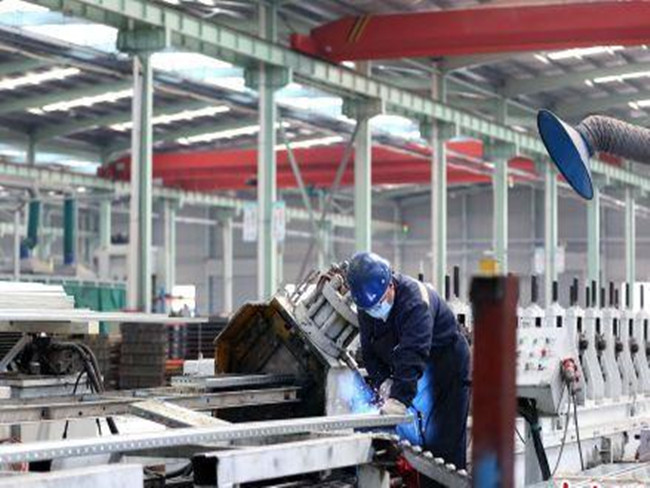 員工在焊接打磨倉儲用的貨架。 景縣融媒體中心供圖