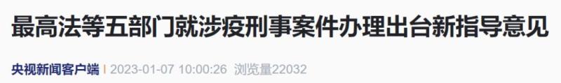 今天(1月7日),最高人民法院、最高人民檢察院、公安部、司法部、海關總署聯(lián)合出臺《關于適應新階段疫情防控政策調整依法妥善辦理相關刑事案件的通知》。