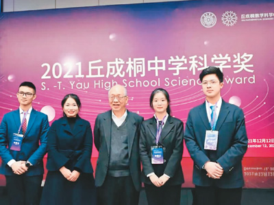 丘成桐(左三)與參加“2021丘成桐中學(xué)科學(xué)獎(jiǎng)”全球總決賽的部分選手和帶隊(duì)教師合影留念。