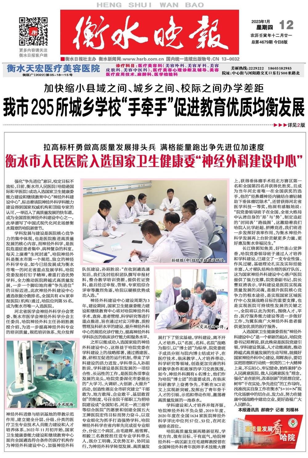 強化“爭先進位”意識,咬定目標不放松,日前,衡水市人民醫院(哈勵遜國際和平醫院)成功入選國家衛生健康委能力建設和繼續教育中心“神經外科建設中心”,標志著該院神經外科學科能力建設得到國家權威機構和頂級專家的認可,一舉邁入了高質量發展的快車道。成為全國首批神經外科建設中心之一,此舉譜寫了中國式現代化河北場景衡水篇章的哈院新章節。
