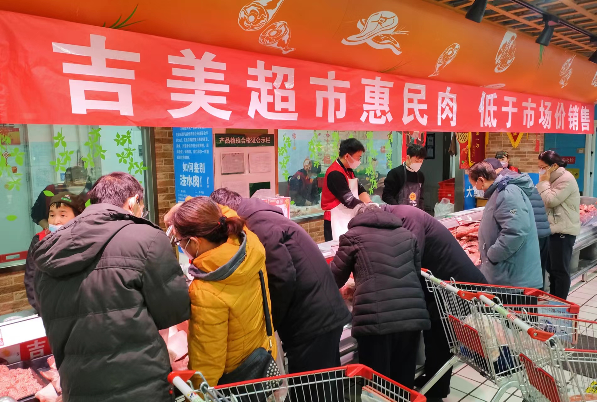 1月13日上午9時30分許,記者走進吉美超市勝利路店看到,貨架上整齊有序地擺放著各類商品。蔬菜水果、生鮮肉食、糖果飲料等各類年貨琳瑯滿目,吸引顧客駐足挑選。條肌肉10.9元/斤、后座肉11.9元/斤、五花肉15.9元/斤……在一樓生鮮肉食區,擺放著各類分割好的豬肉產品,在高高懸掛的“吉美超市惠民肉 低于市場價銷售”標語下,不少市民正在精心挑選。“今年豬肉便宜,我買了十多斤五花肉,打算回家熏肉,準備過年。”市民陳大爺說。