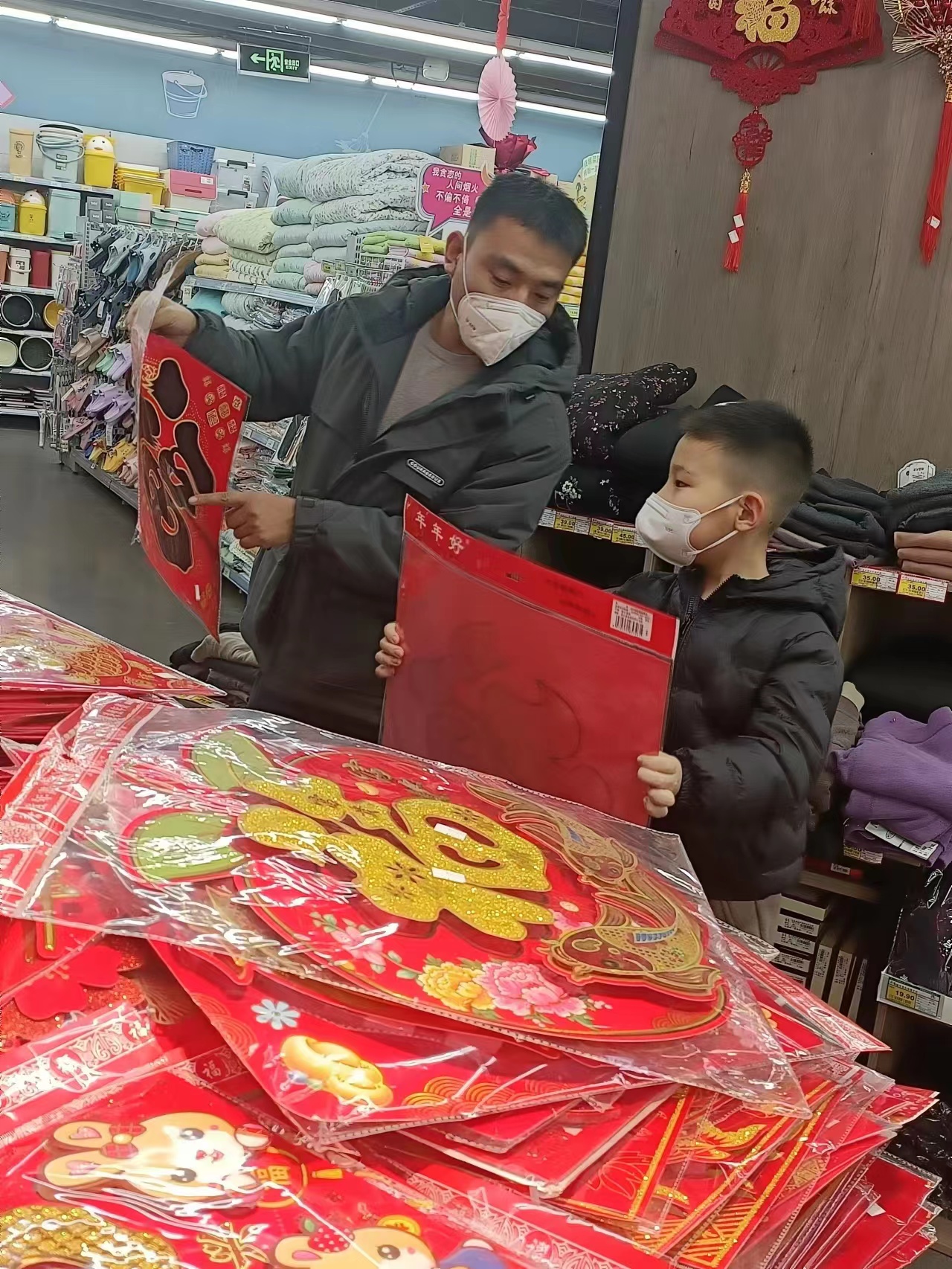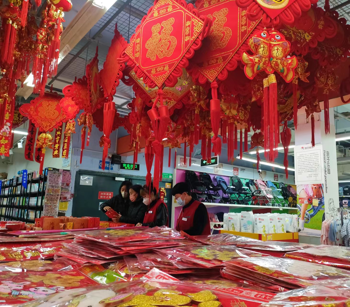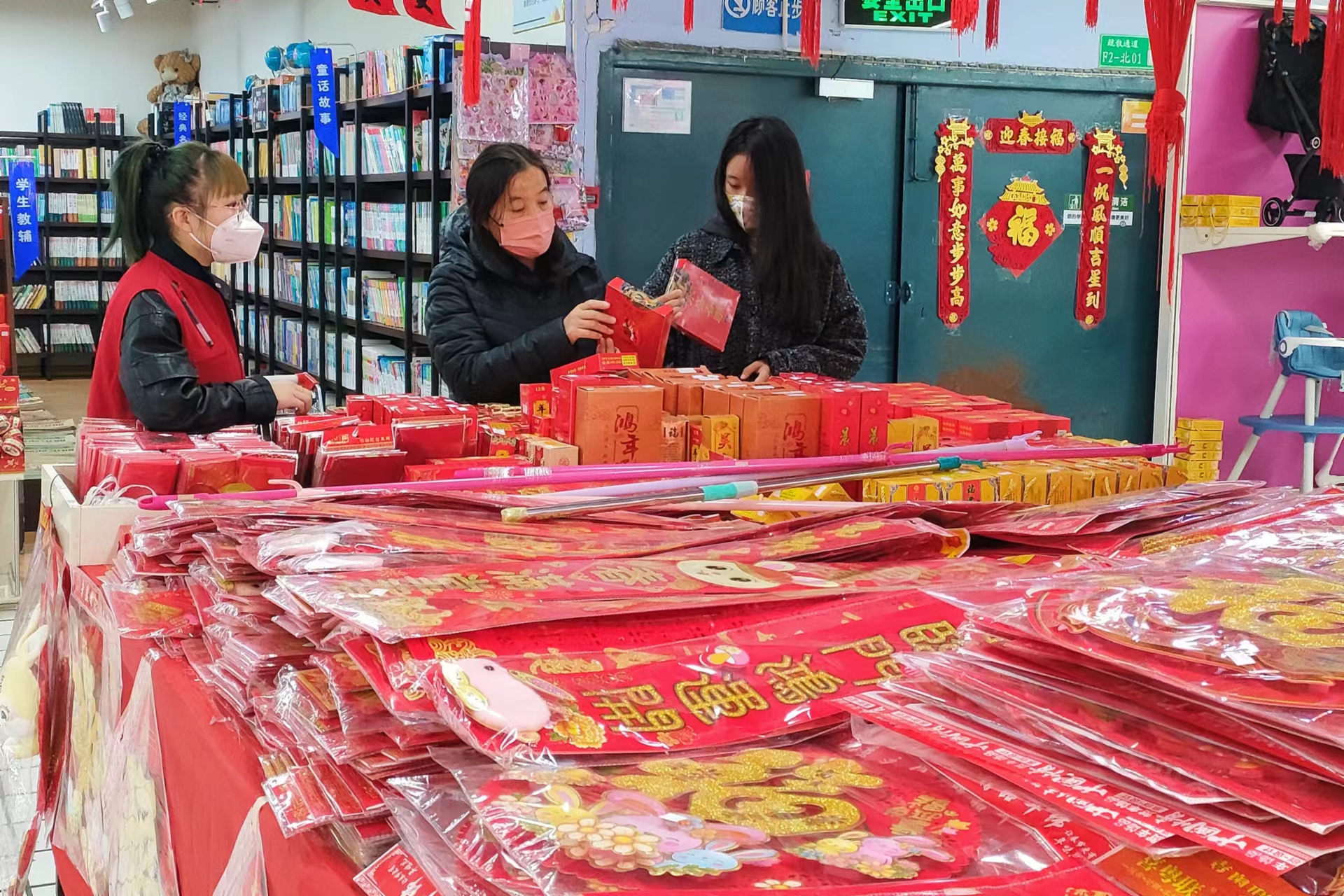 春聯、中國結、燈籠、兔元素玩偶……在超市二樓,代表著喜慶祥和、歡樂熱鬧的各種春節裝飾襯得超市紅紅火火。“有稍微小一些的對聯嗎?我打算貼在入戶門上。”市民張女士和女兒駐足在春聯福字貨架前,一邊詢問工作人員,一邊挑選心儀的對聯。“春節需要儀式感,趁著今天有空兒,來把過年需要的春聯和窗花等飾品買回家,到時把家里裝飾的美美噠,開開心心過大年!”張女士笑著說。