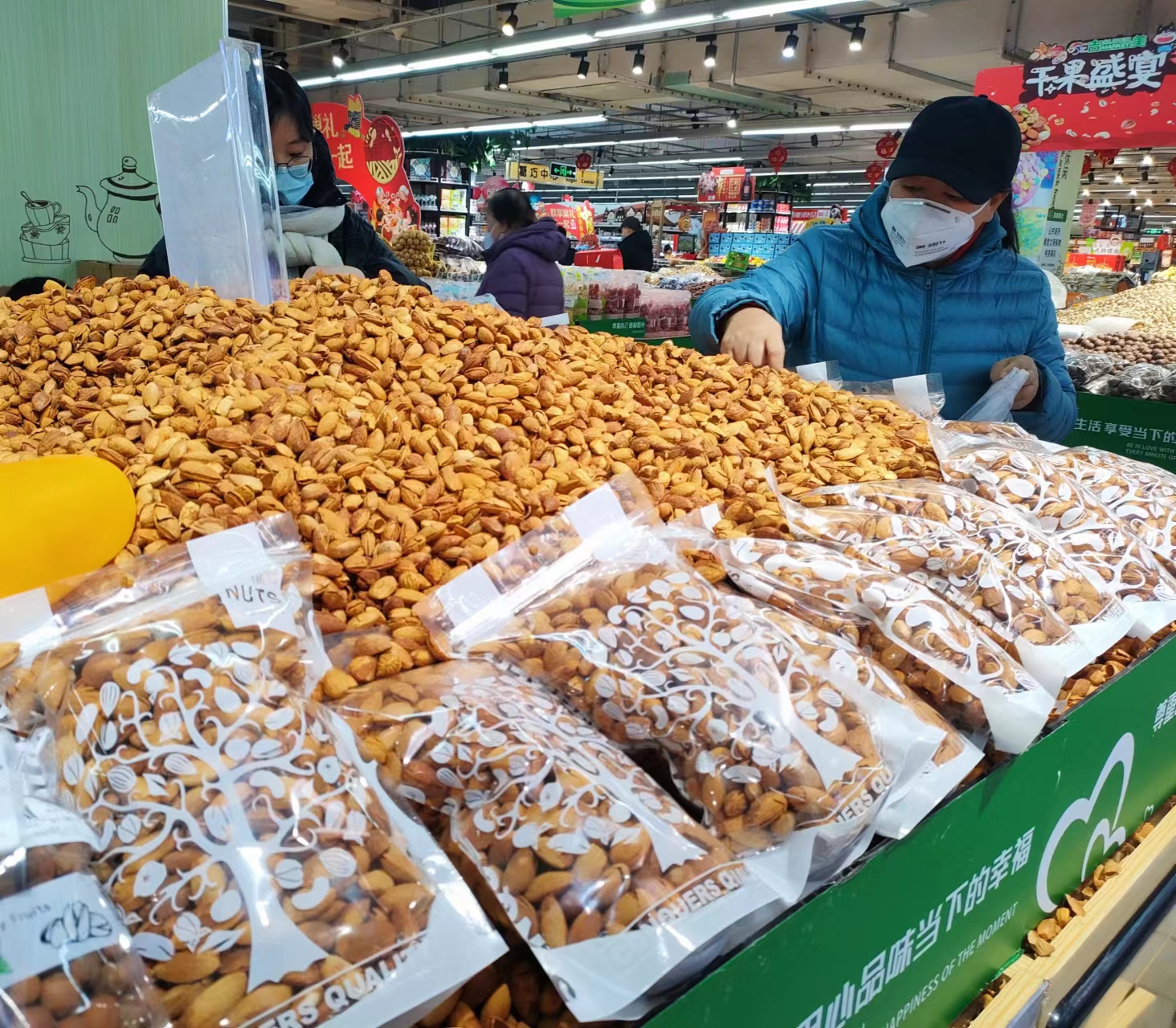 辦年貨早已成為一種過年的儀式,記錄著最濃郁的年味兒。1月13日上午10時許,記者隨著一波人流進入怡然城超市。“年貨一條街”上,糖果餅干、酒水飲料、臘味干貨等各式年節商品琳瑯滿目,處處洋溢著歡樂中國年的濃郁氛圍。賣場內人流如織,市民在擺滿各類年貨商品的貨架間穿行,選購著心儀年貨。“兩年沒回家過年了,今年一定要回去團聚,趁著放假,給親朋好友買點兒年貨。”市民梁先生邊說邊拿了兩箱堅果放到購物車。記者注意到,市民們的購物車內多為禮盒裝的商品,有牛奶、巧克力、酒水、水果等。