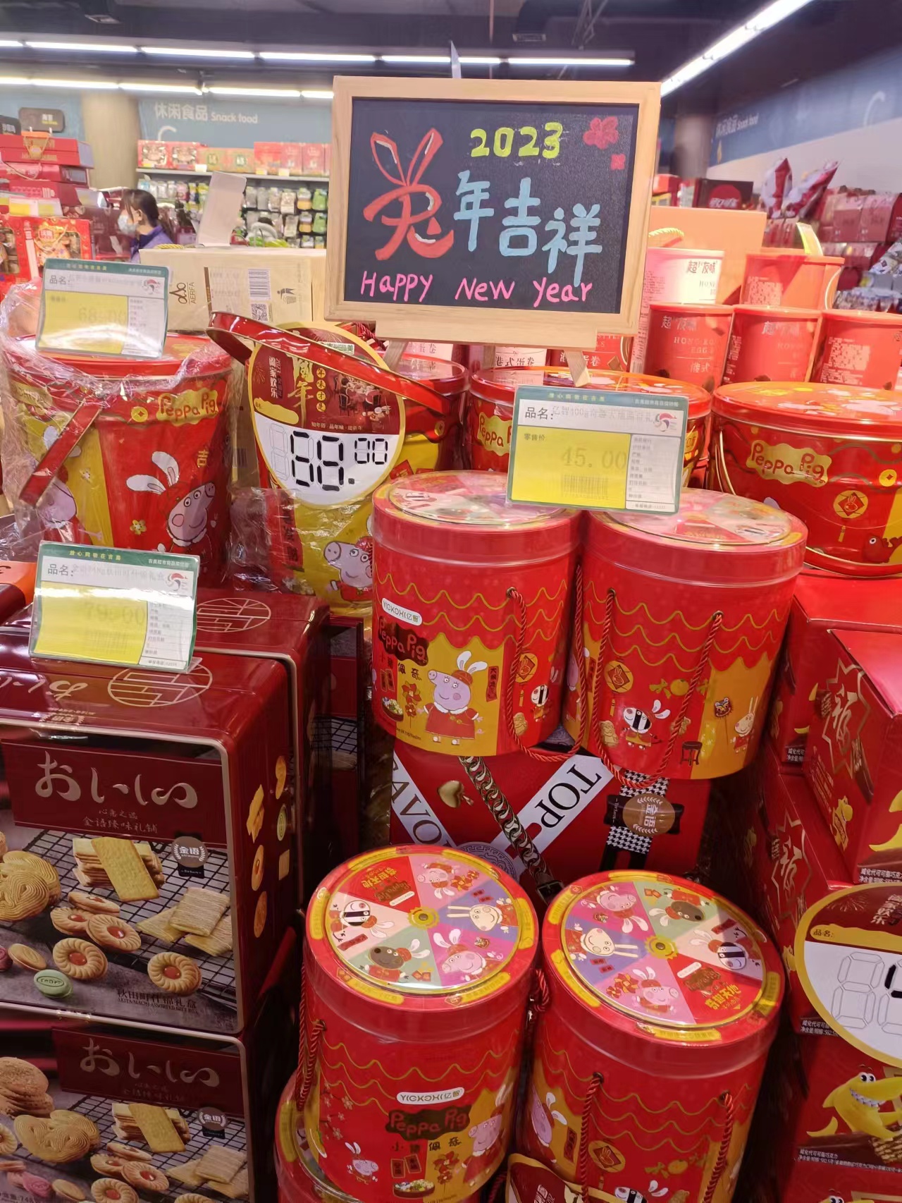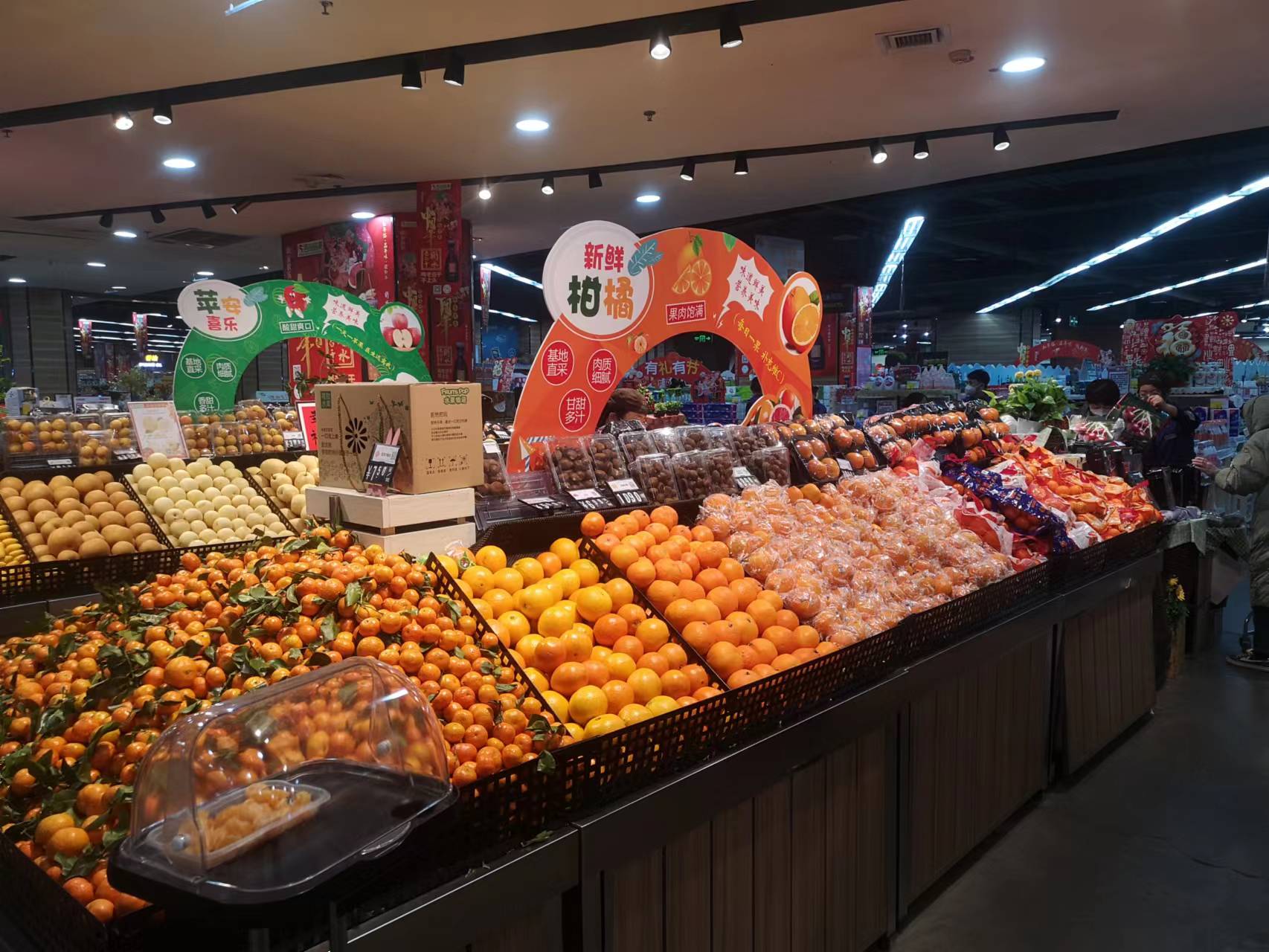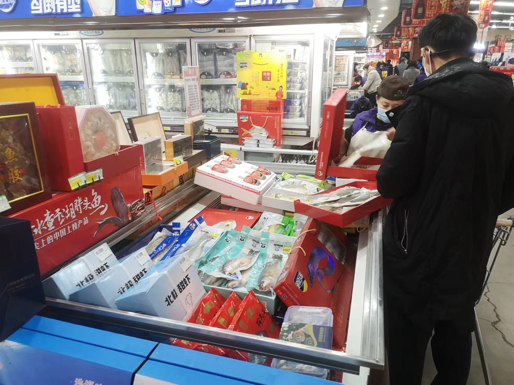 在一樓的超市進出口處,紅彤彤的燈籠和各種春節掛件分外惹眼。進入超市,各式各樣的年貨琳瑯滿目,包裝精美的糖果、外觀喜慶的飲料、年味十足的腌制品等應有盡有,各種水果、蔬菜、海鮮、肉類貨源充足,品種齊全。