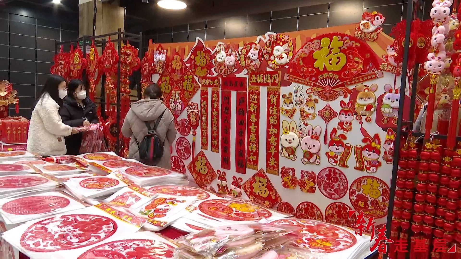 為滿足市民多樣化的購物需求,超市增加了許多年貨種類,金兔、福兔、玉兔等兔元素福貼、窗花、掛件、燈籠吸引了不少人選購。紅色的春聯及福字整齊地掛滿了貨架,讓人充分感受到兔年的喜慶氛圍。