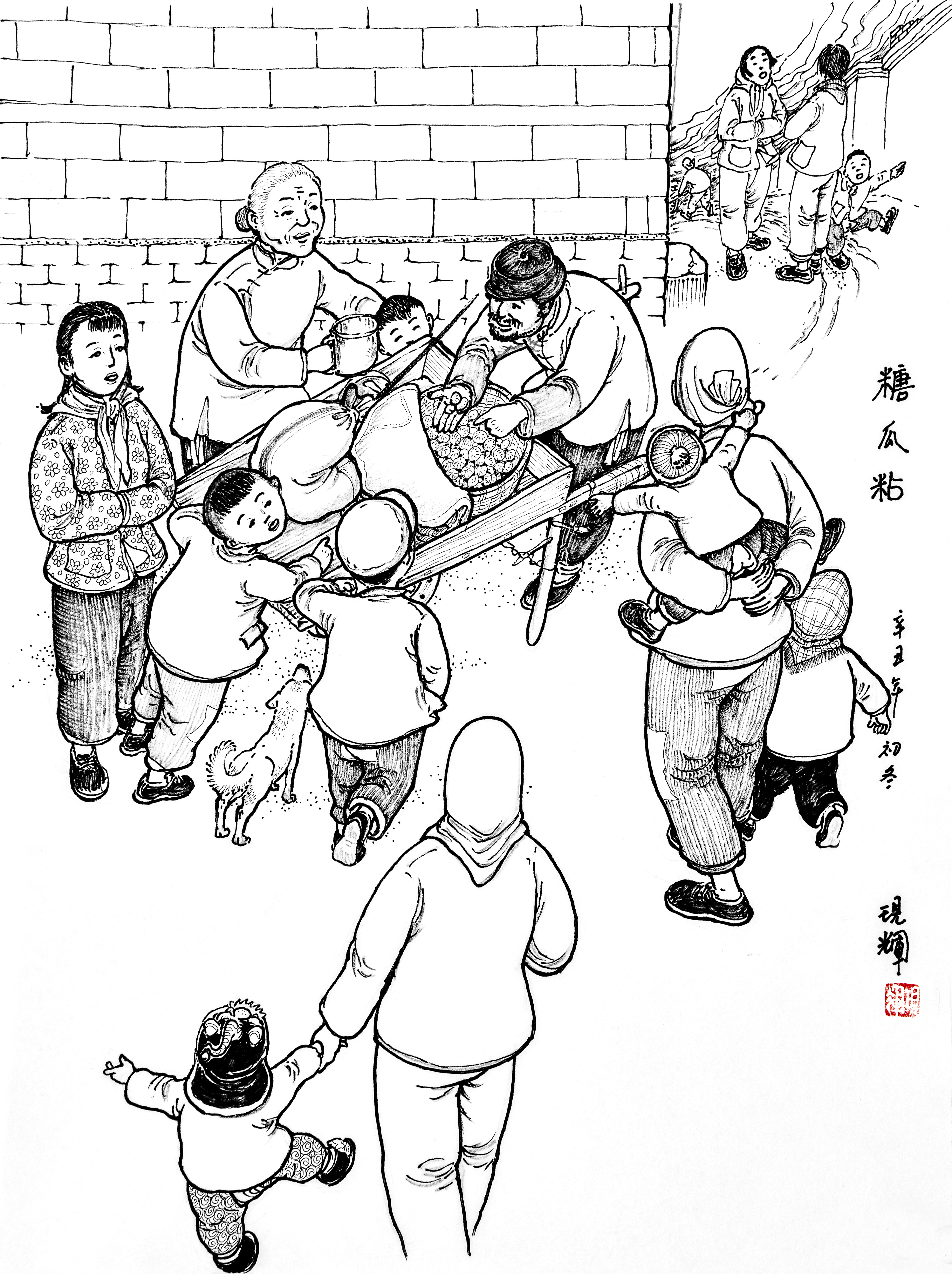 到了臘月二十左右,村里就來賣糖瓜的老人了。他推著一個獨輪平板車,上邊“殼簍”里有糖瓜,人們都買一點(或用糧食換)送灶王爺時用,我們幾個開心地圍著車子轉,總想趁機“弄”一個吃,老頭小氣哩很,“把”得很嚴,一個也不多給!廿三大人上完供才分給我們吃。