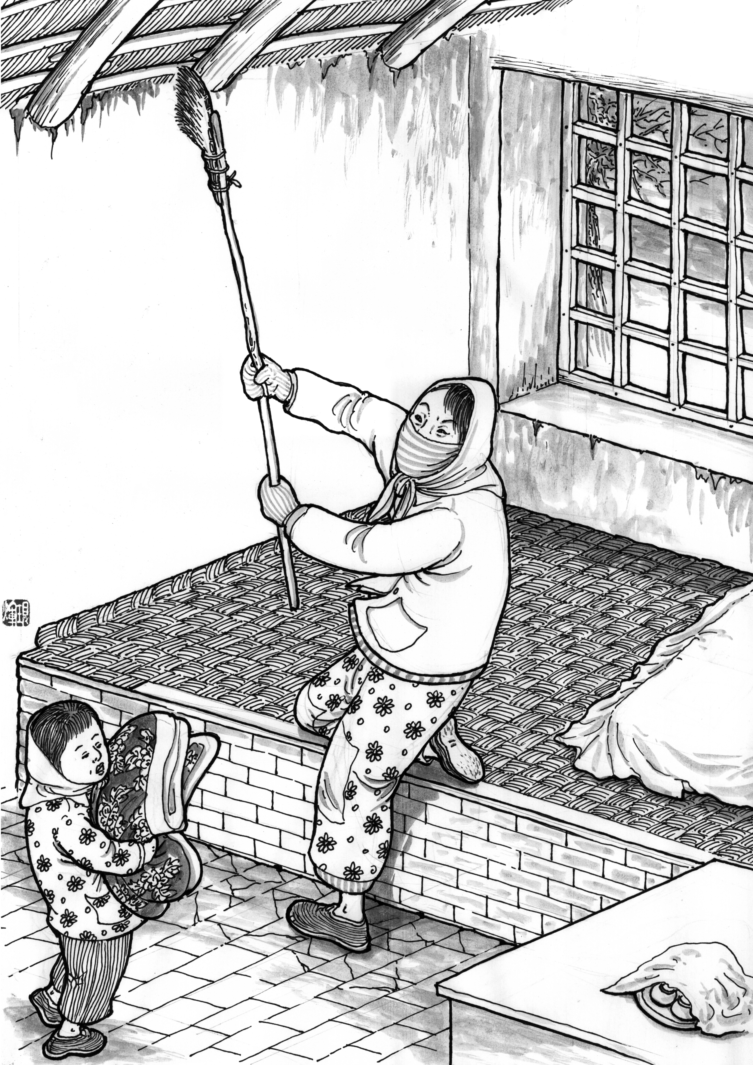 小時候快過年時要掃屋子,先把屋里的東西搬到院子里。娘頭蒙上手巾,用長桿子綁上笤帚,掃干凈房頂犄角旮旯沉積了一年的灰塵。