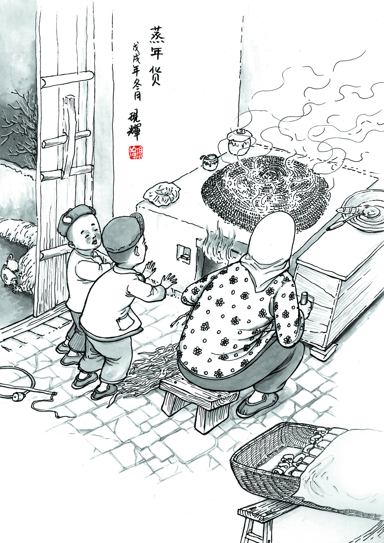 小時候過年要蒸很多饃饃(饅頭)、年糕。記得母親蒸了一鍋又一鍋,堆滿了一大笸籮,等涼了放在一個缸里儲存起來,足夠一家子吃一個正月。那時很冷,不用擔心壞了,不住人的屋子就是天然的冰箱……有時也蒸帶棗的棗花,我偷著摳上邊的棗吃……