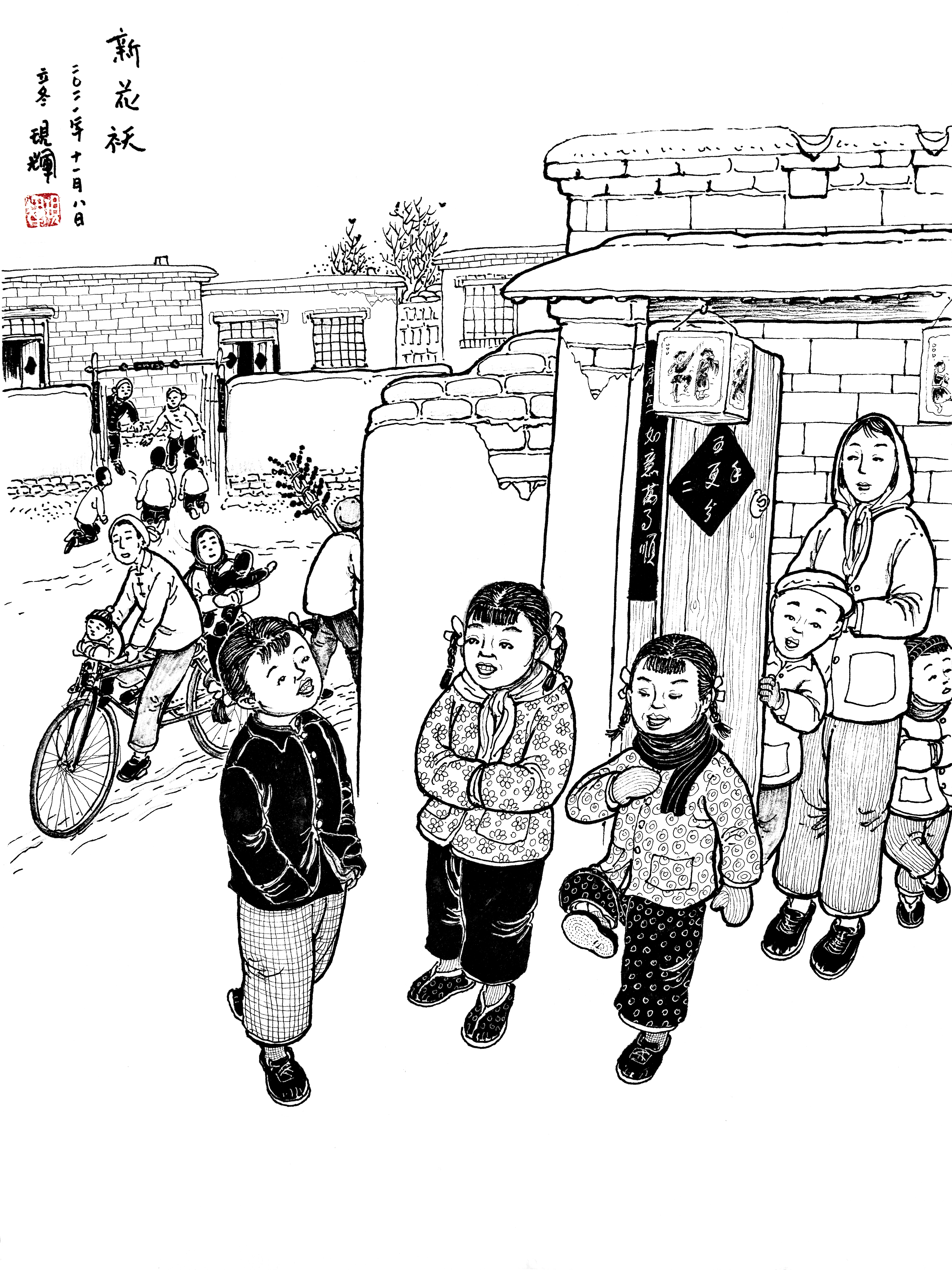 那時的院子沒有大門,好多人家都是兩截土墻頭。父親有辦法,兩根木桿上邊橫著再綁一個桿,就是大門了。貼上對聯,馬上就年味十足,吉祥滿院了……我們小孩子喜歡一家一家看對聯,看誰能念對,開心的大年開始了!