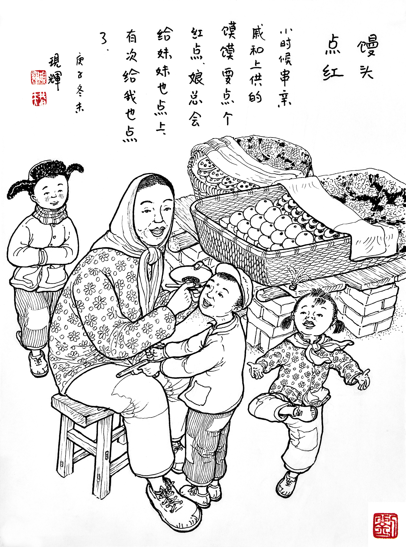 過了臘月二十,家里開始準備過年用的饅頭和包子。娘手特別巧,她會做小豬、小兔子、小刺猬棗花,還在它們鼻子上點紅點兒。白胖胖的小豬紅艷艷的鼻子,可愛極了!我和妹妹嚷著讓娘給我們也點上。這些饅頭和包子從初一吃到十五以后,整個年都是輕松的,大人孩子不用再干活了。