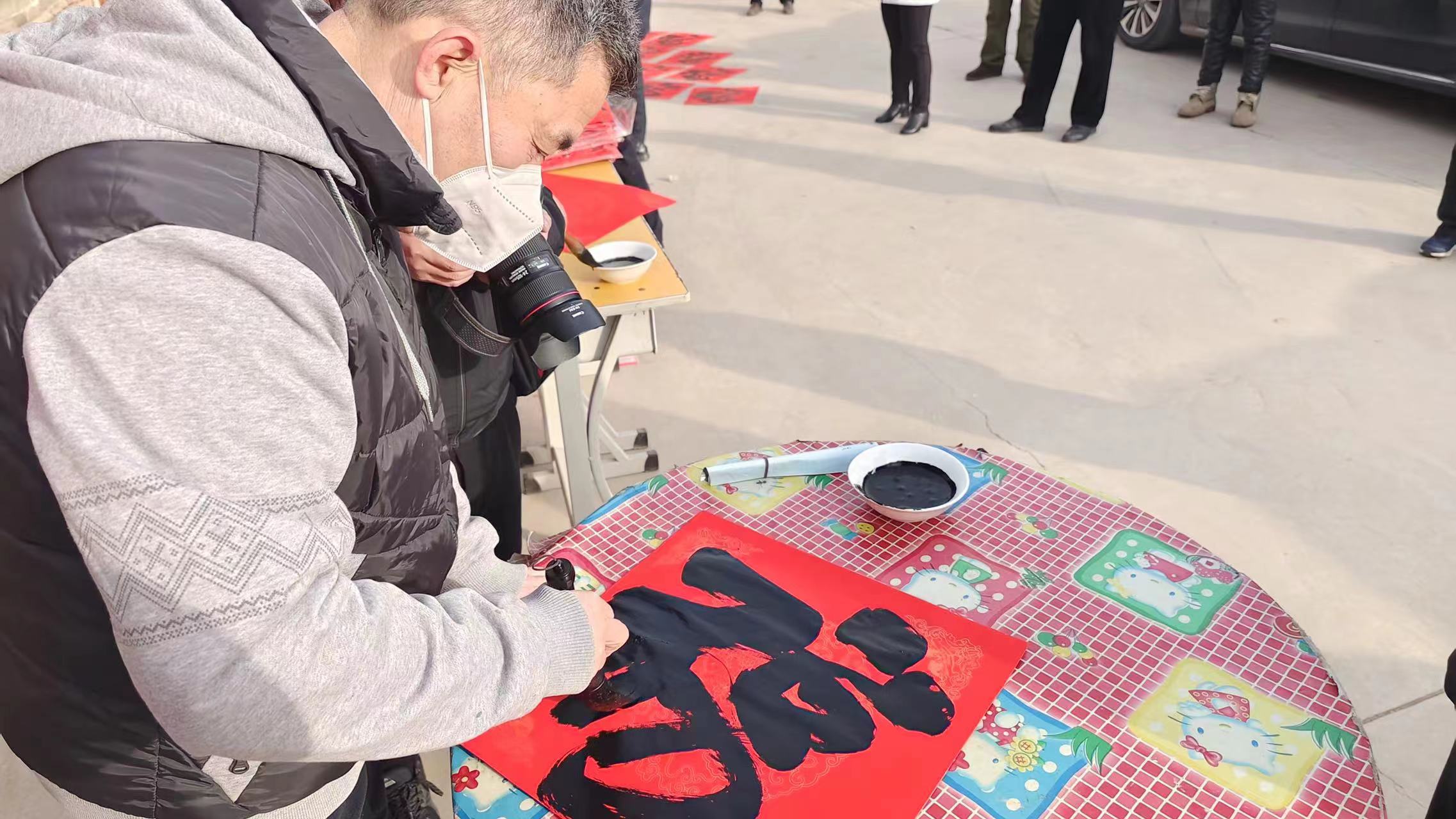 17日,活動(dòng)組織先后來(lái)到武邑縣審坡鎮(zhèn)前小興村和趙橋鎮(zhèn)后主布村,為這里的村民送上新春祝福。活動(dòng)現(xiàn)場(chǎng),武邑縣書(shū)法家協(xié)會(huì)的書(shū)法老師們揮毫潑墨,以嫻熟的筆法書(shū)寫(xiě)出對(duì)來(lái)年迎祥納福的美好心愿。他們還根據(jù)鄉(xiāng)親們的個(gè)性化需求,為大家書(shū)寫(xiě)了一批獨(dú)具特色的春聯(lián),將文化熏陶融入文化惠民之中。濃郁墨香飄散,不一會(huì),桌上、地上擺滿(mǎn)了一副副紅紅火火的春聯(lián),一個(gè)個(gè)飽滿(mǎn)的“福”字,工作人員將這些帶著冬日溫暖的新春祝福送到鄉(xiāng)親們手中。