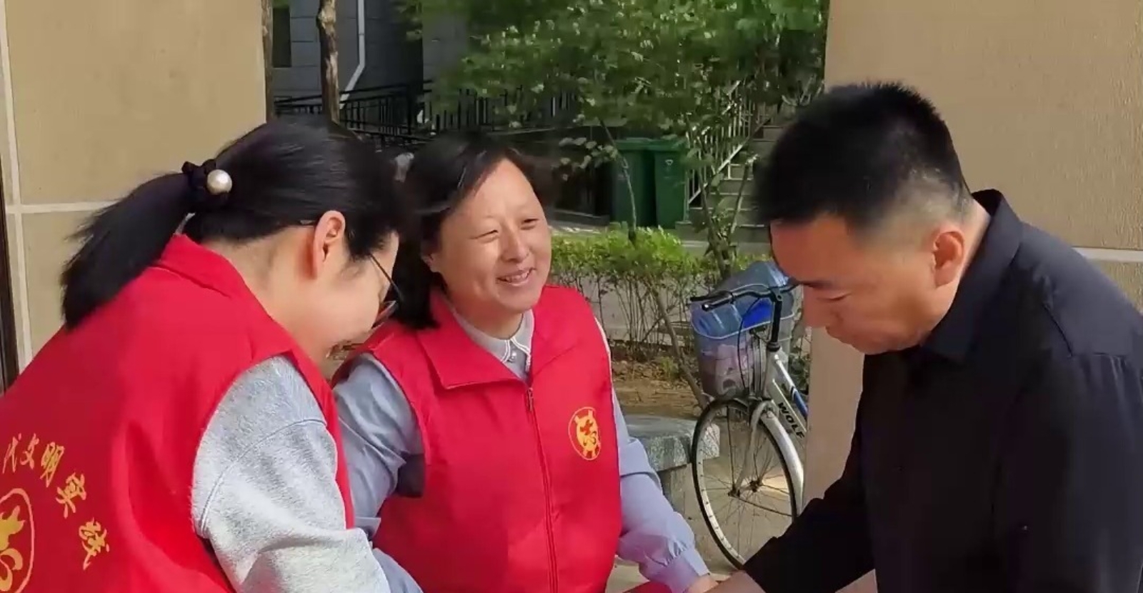 桃城區農業農村局工作人員(左)向農民群眾發放宣傳資料。劉路 攝