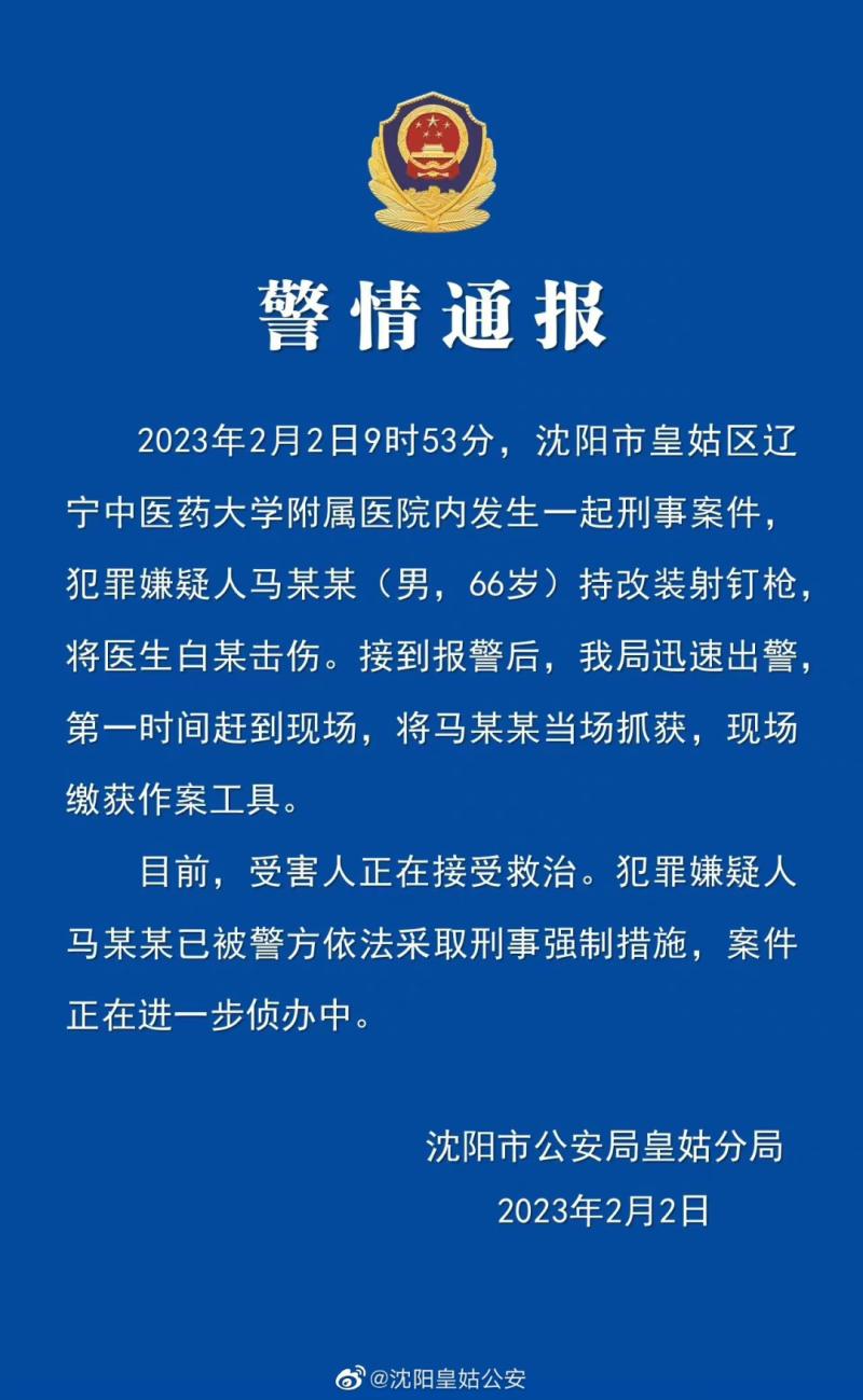 2月2日,遼寧沈陽發(fā)生一起傷害醫(yī)生案件,引起社會關注。當晚,沈陽市公安局皇姑分局通報案情: