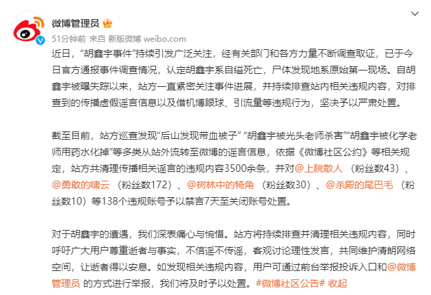 截至目前,站方巡查發現“后山發現帶血被子” “胡鑫宇被光頭老師殺害”“胡鑫宇被化學老師用藥水化掉”等多類從站外流轉至微博的謠言信息,依據《微博社區公約》等相關規定,站方共清理傳播相關謠言的違規內容3500余條,并對@上院散人 (粉絲數43)、@勇敢的嘯云 (粉絲數172)、@樹林中的犄角 (粉絲數30)、@殺殿的尾巴毛 (粉絲數10)等138個違規賬號予以禁言7天至關閉賬號處置。