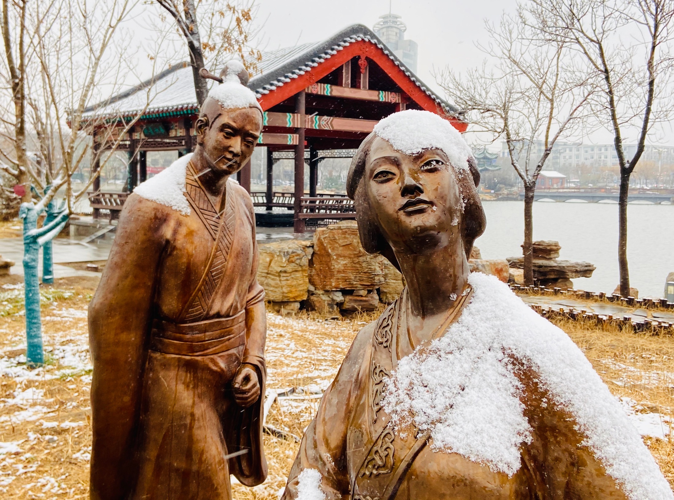 大片的雪花洋洋灑灑,帶來了冬春交替的浪漫,以潤澤萬物的方式為春天造勢。雪后的衡水大地,春景與白雪交織在一起,別具一番風韻。草地、樹木被無瑕的白雪覆蓋,卻蓋不住盎然的春意;街頭的大紅燈籠上,仿佛被撒上了一層雪白的糖霜;公園里,一座座精美的雕像,一不小心就白了頭;路上的行人,放下了雨具,任由雪花精靈般肆意落在身上。